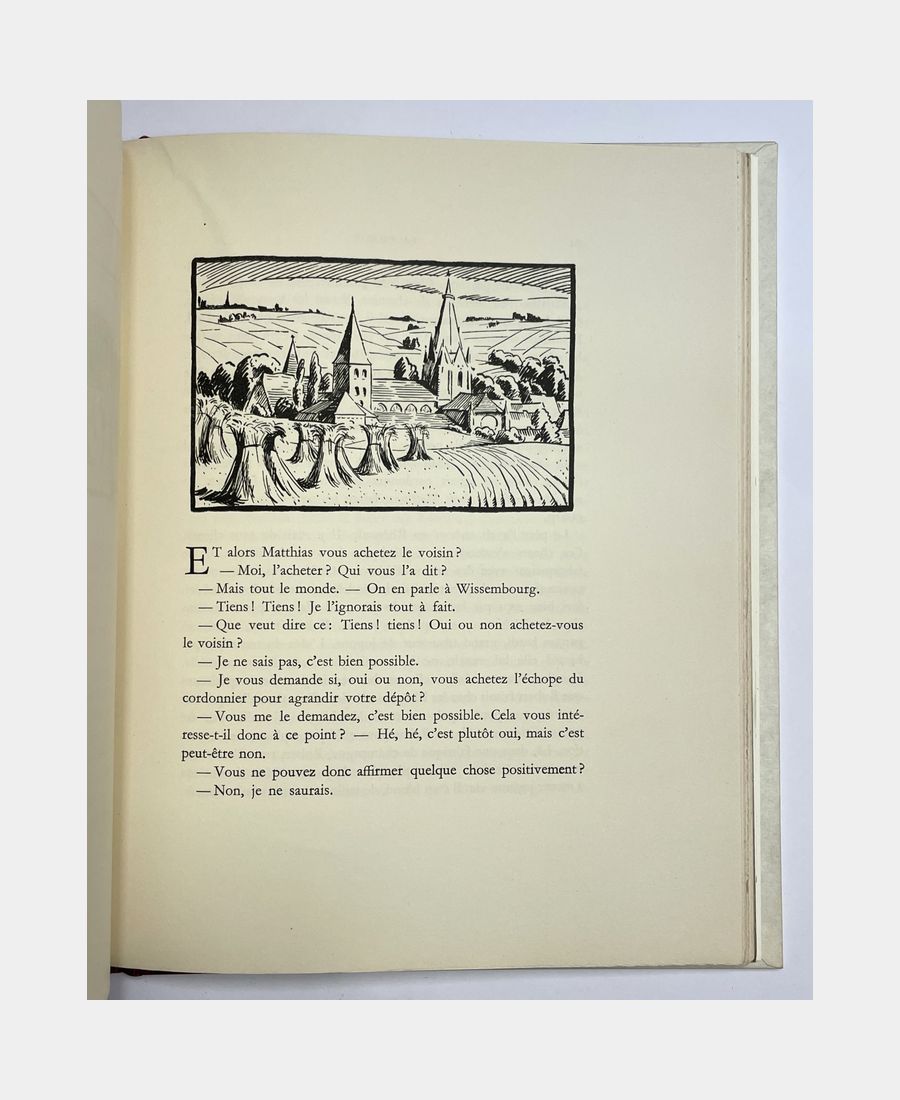 Strasbourg, Collection de la Vie en Alsace, 1926 ; petit in-4 de 114 pp. Demi-skyvertex rouge postérieur signé Magar, auteur et titre dorés au dos. Pliure marginale p. 39. Ex-libris personnel de l’artiste Louis-René Becker et d’E. Werner. Édition originale au tirage limité à 305 exemplaires, ici l’un des 265 exemplaires numérotés sur pur fil Lafuma (n°225). Les couvertures sont conservées. Bel exemplaire.