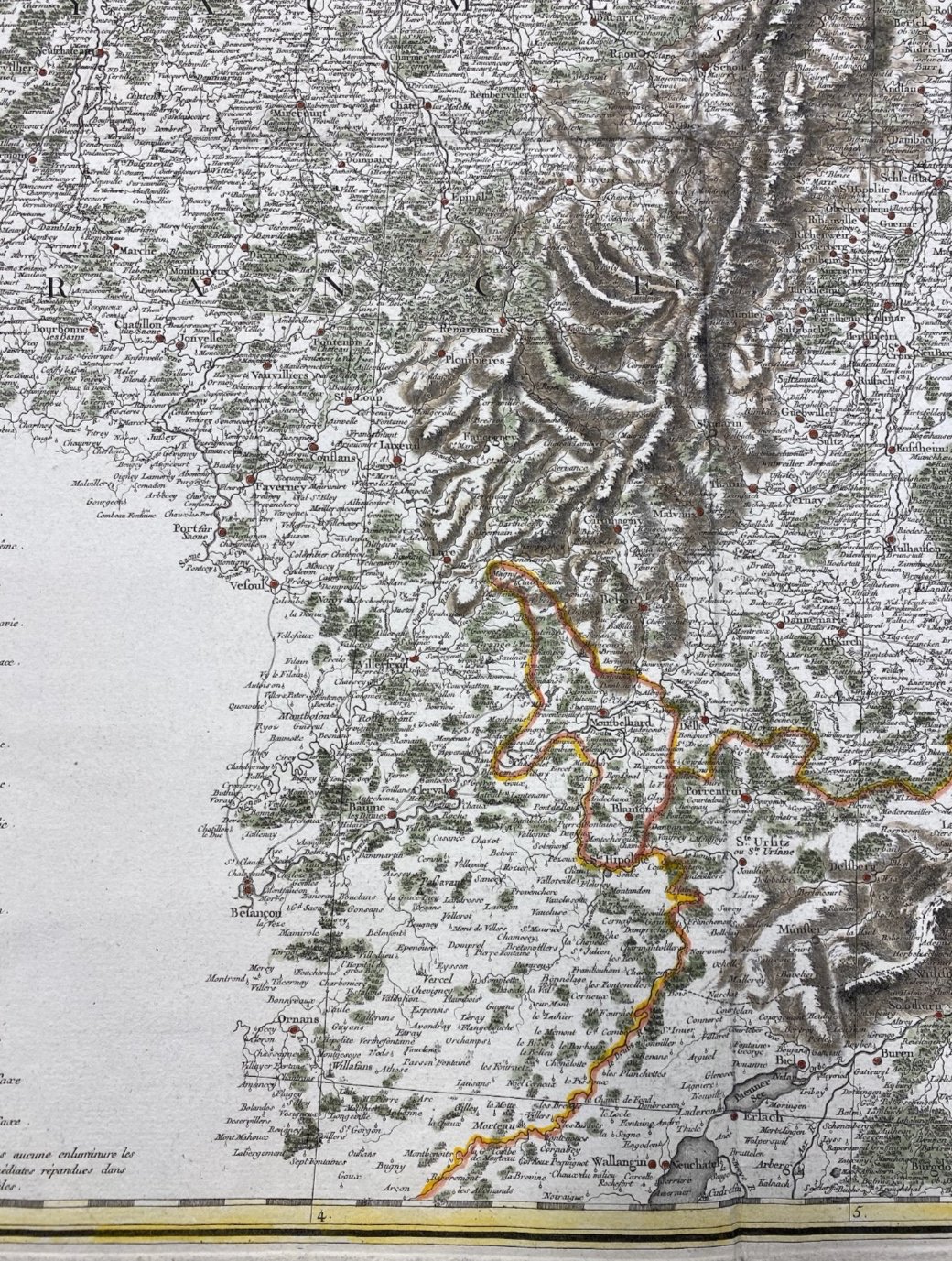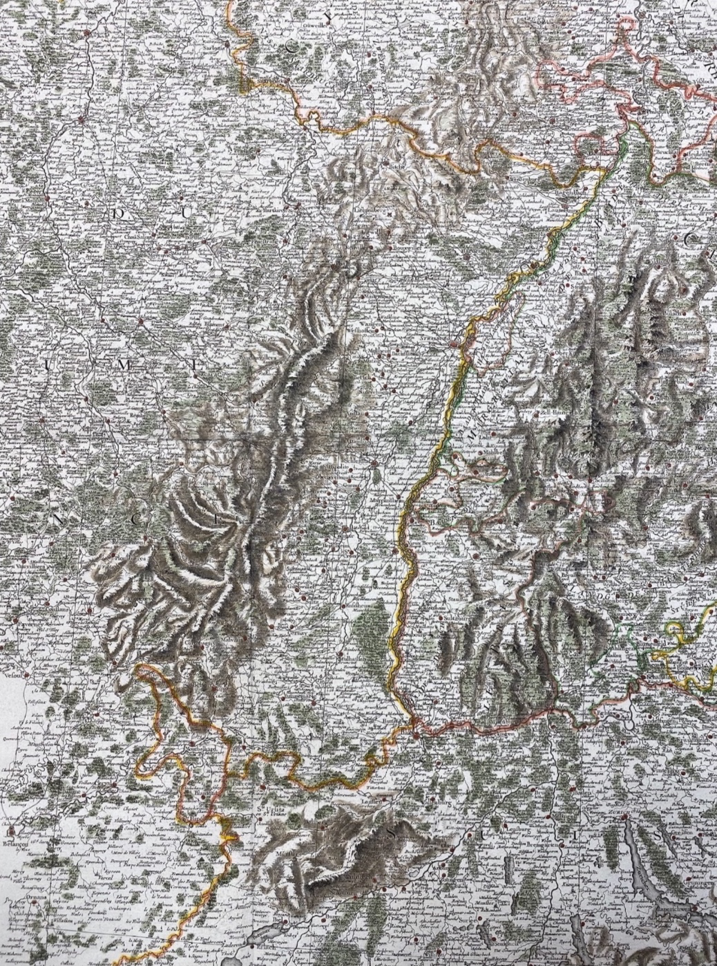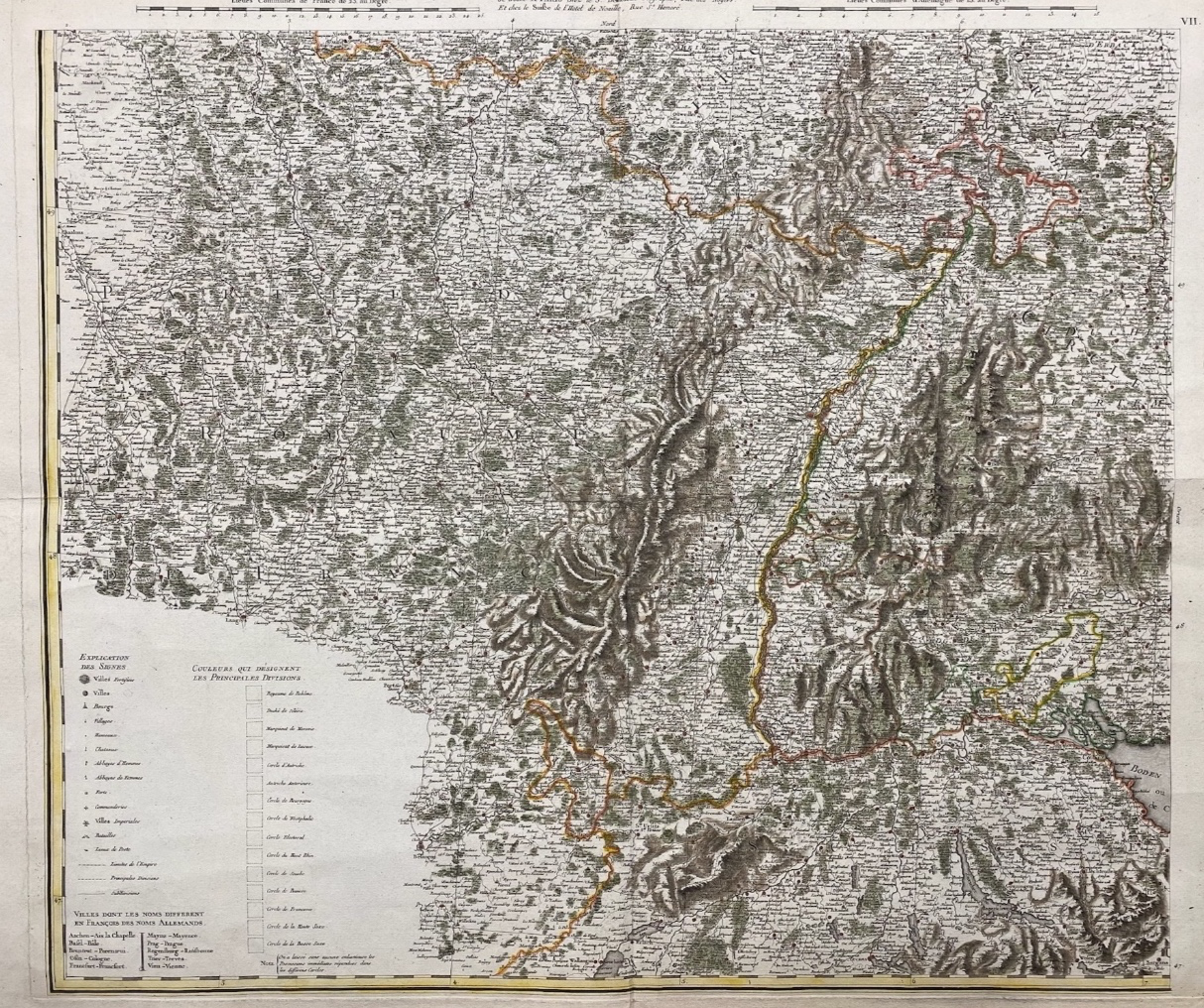 Carte très détaillée allant de Chalon à Stuttgart d’Ouest en Est et de Grumbach à Neuchâtel du Nord au Sud.