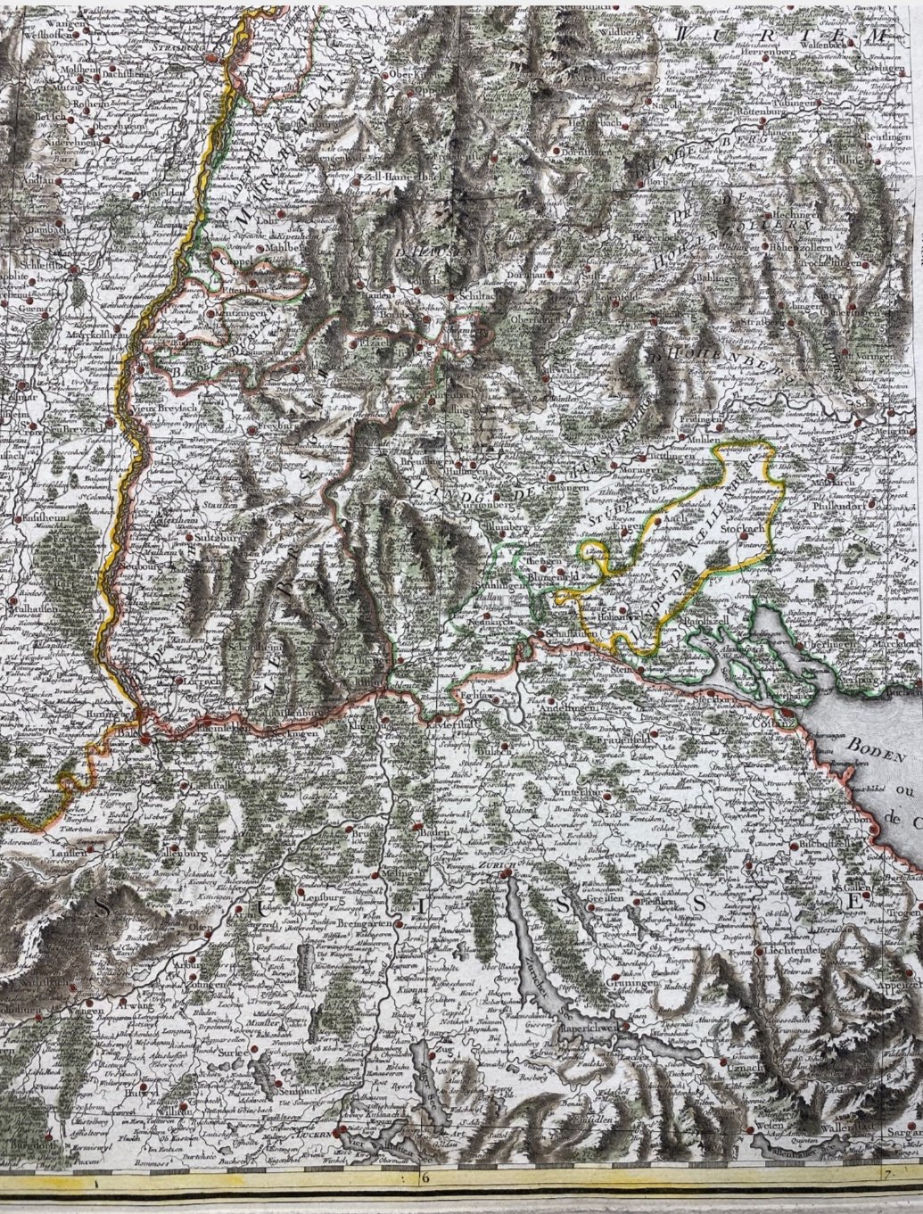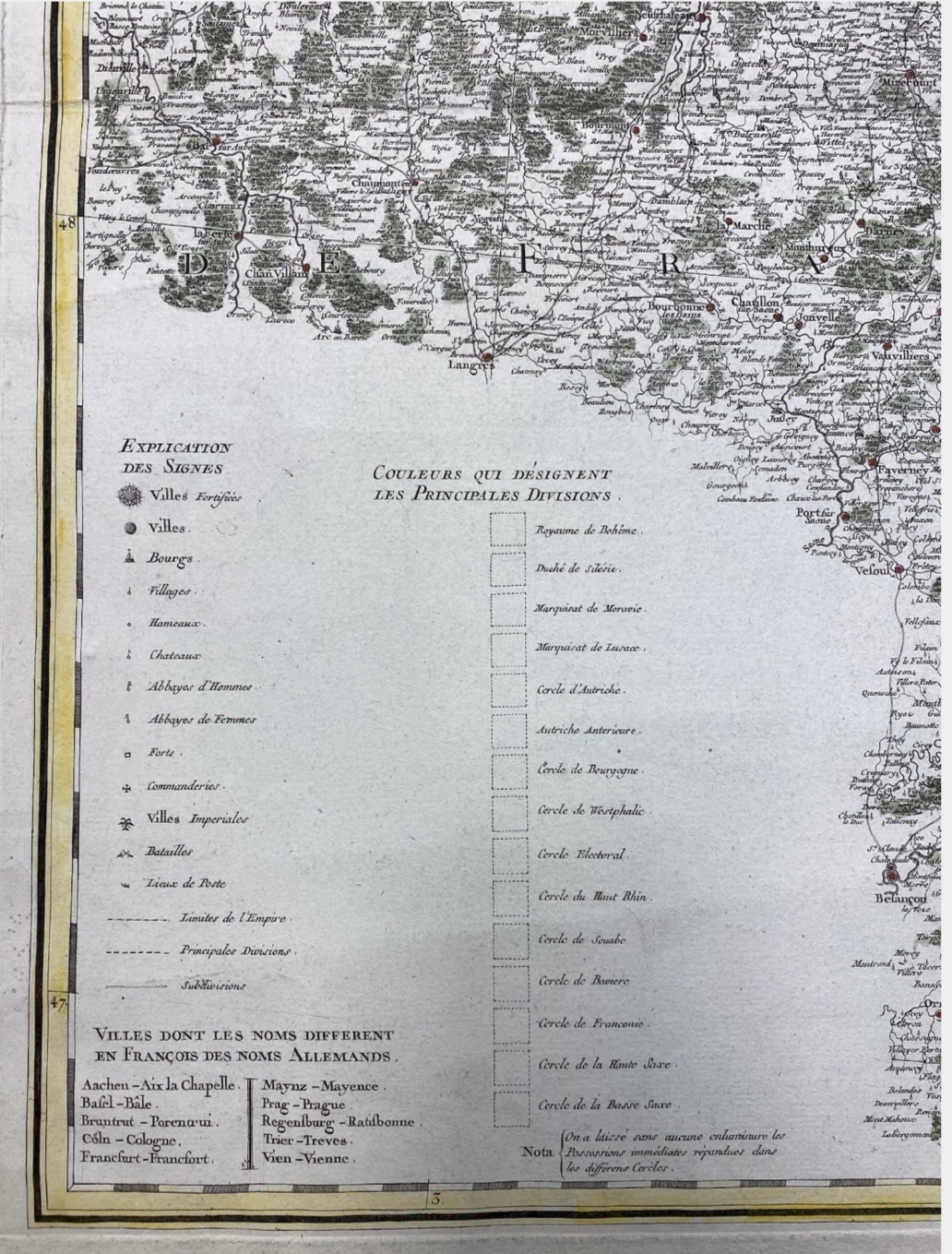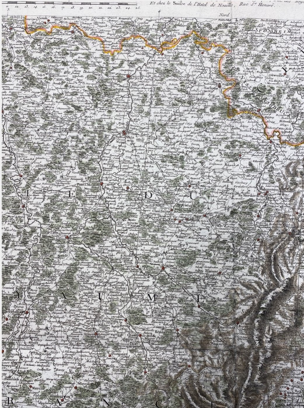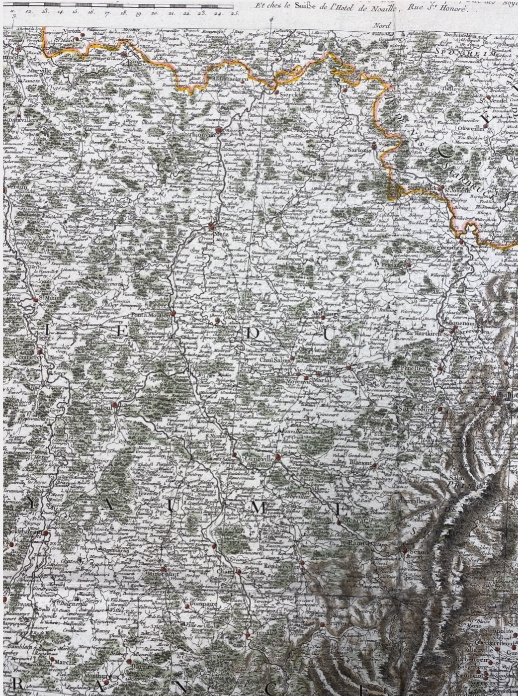 Carte très détaillée allant de Chalon à Stuttgart d’Ouest en Est et de Grumbach à Neuchâtel du Nord au Sud.