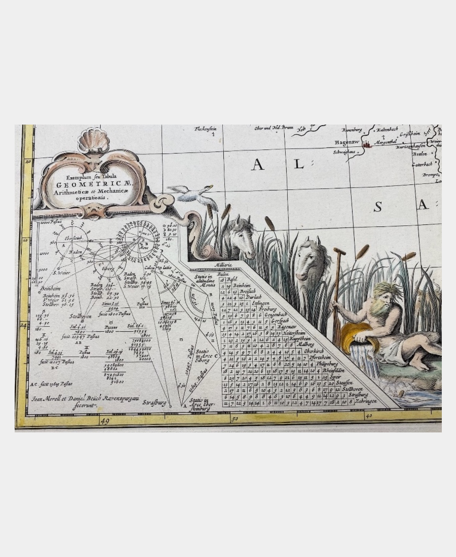 La partie basse gauche de la carte présente une méthode de calcul des distances entre les villes par triangulation et une table arithmétique réalisées par Johann Morell et Daniel Beüch.