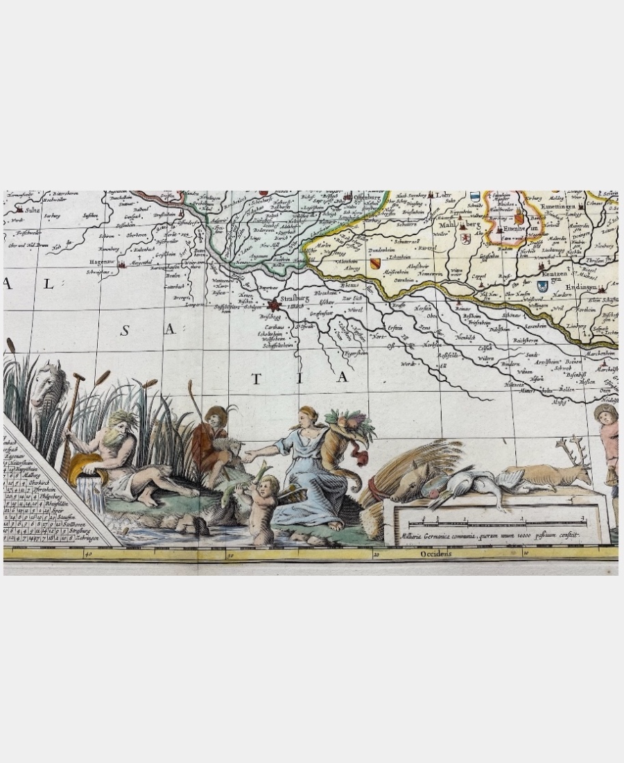 Grand format présentant en sus une carte de calcul des distances, et agrémenté de nombreuses figures champêtres et mythologiques symbolisant les richesses du Rhin.