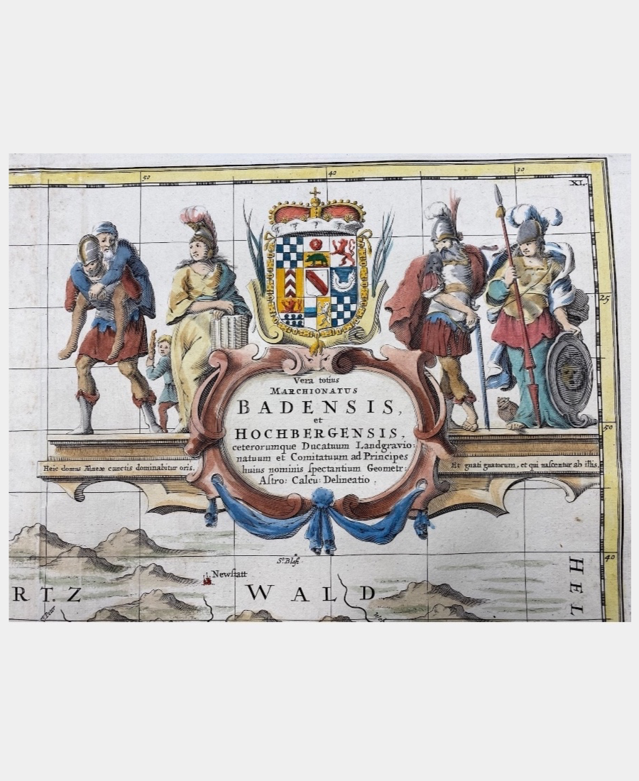 Très belle et grande carte, agrémentée de décors champêtres et agricoles ainsi que de blasons, figures guerrières et mythologiques.