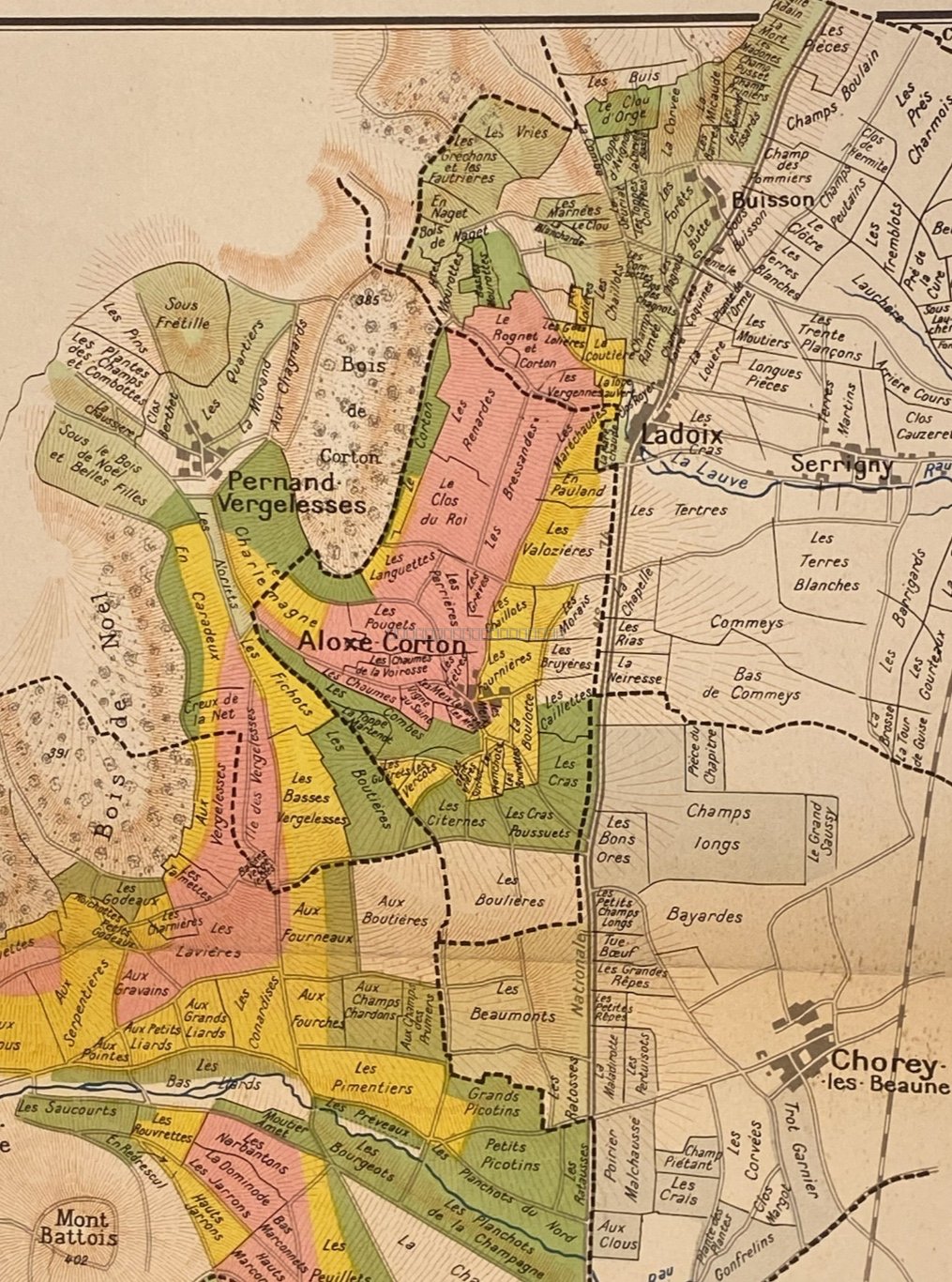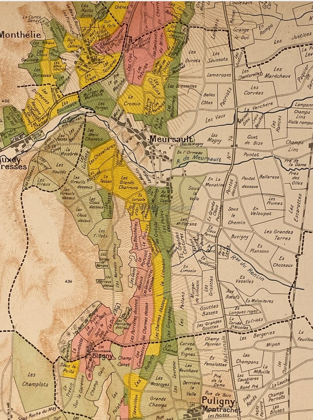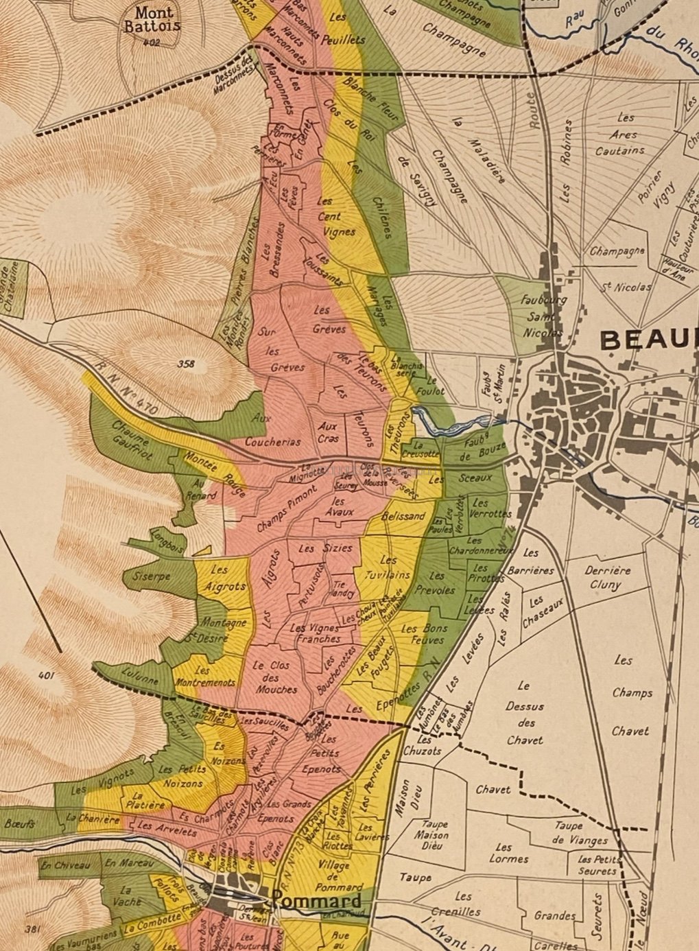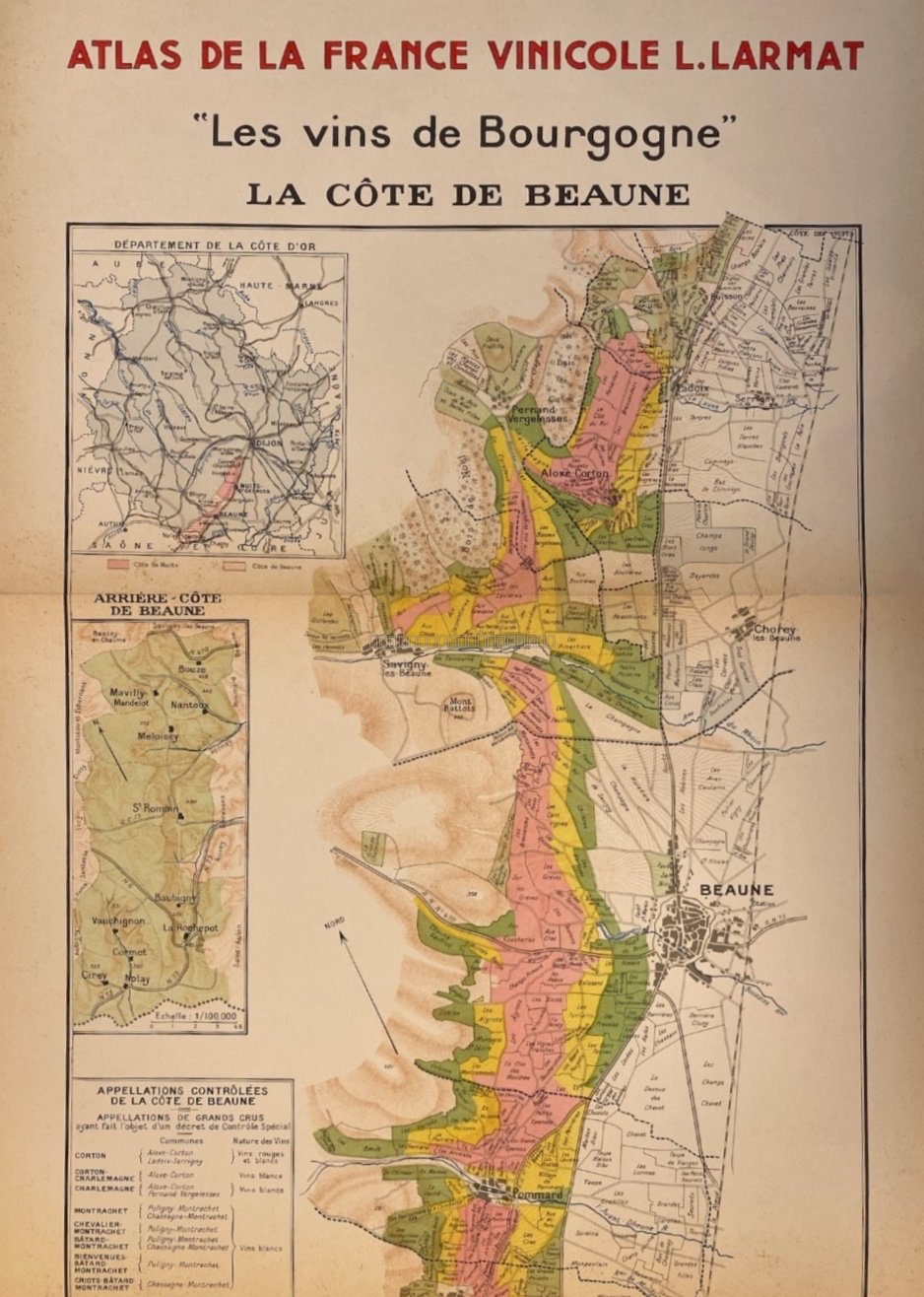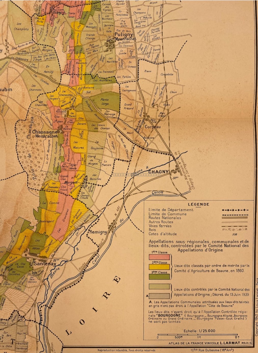 Publiée dans le volume Les Vins de Bourgogne de l’Atlas de la France vinicole, la carte de la Côte de Beaune réalisée par Louis Larmat constitue l’une des représentations les plus précises et les plus emblématiques du vignoble bourguignon au XXe siècle. Elle offre une cartographie détaillée des communes et des climats prestigieux de la Côte de Beane, tels que Volnay, Pommard, Monthélie, Ladoix, Santenay, Puligny, Chassagne, Meursault … , en distinguant les crus selon un code couleur reflétant leur hiérarchie qualitative. Par la finesse de son tracé et la richesse de ses informations, cette carte témoigne de l’effort de structuration et de reconnaissance des appellations d’origine contrôlée en cours à cette époque.