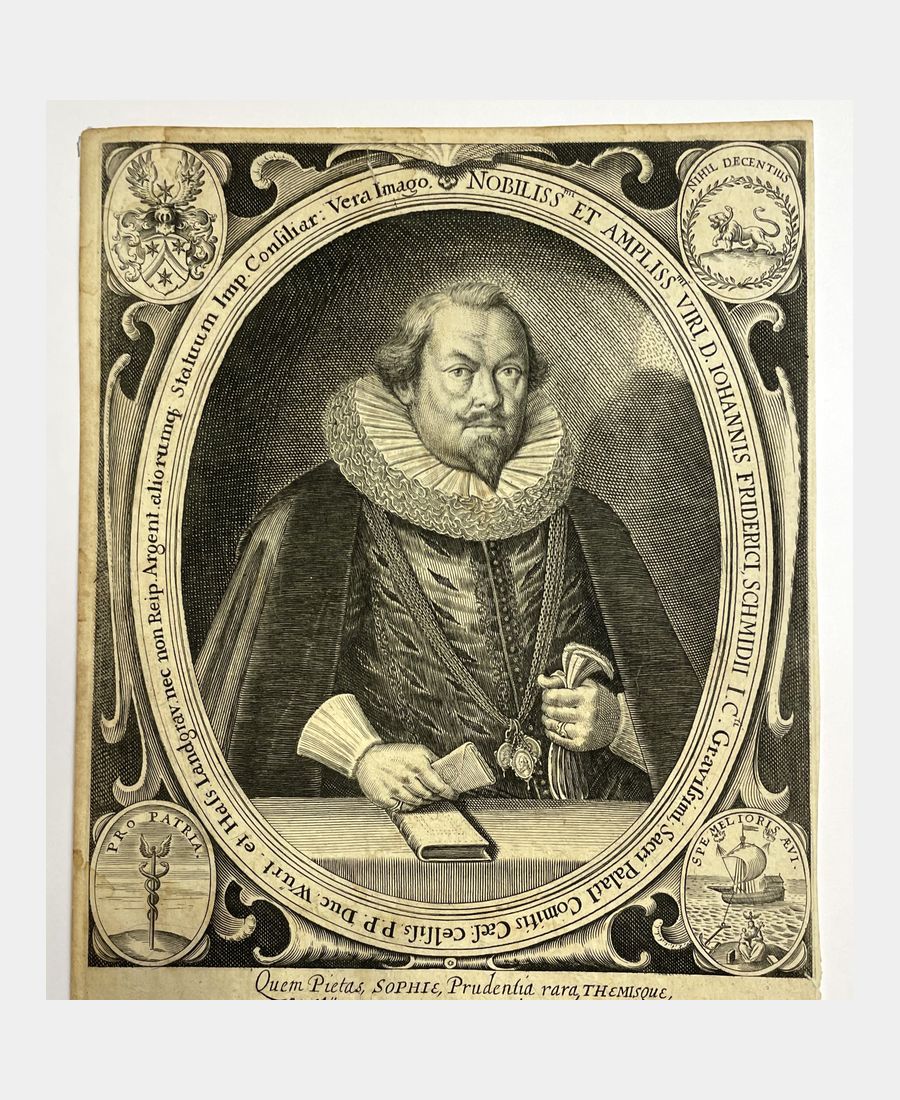 Portrait de Jean-Frédéric Schmid. 1637. Gravure sur cuivre de Jacob van der Heyden. Faibles marges. A noter quelques traces d’humidité et la restauration d’une petite déchirure centrale en haut de la gravure. Dimension : 23,8 cm x 15,2 cm.