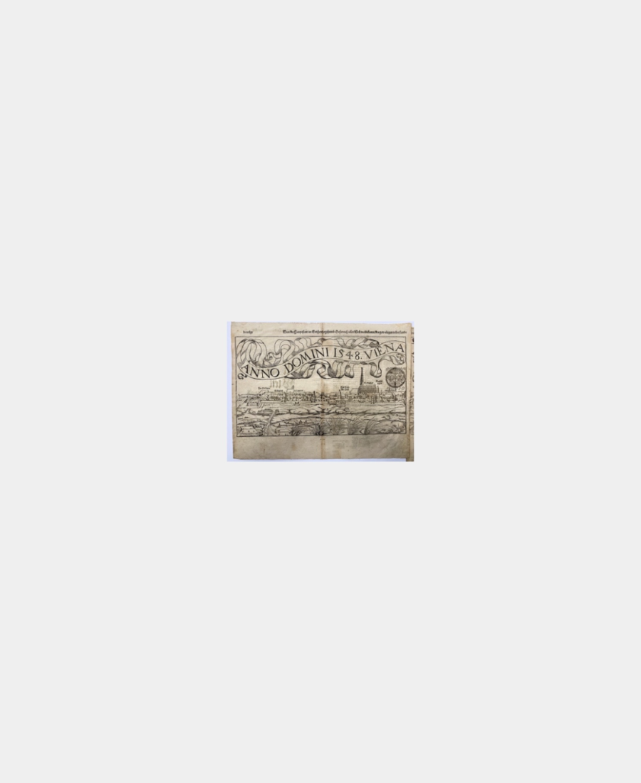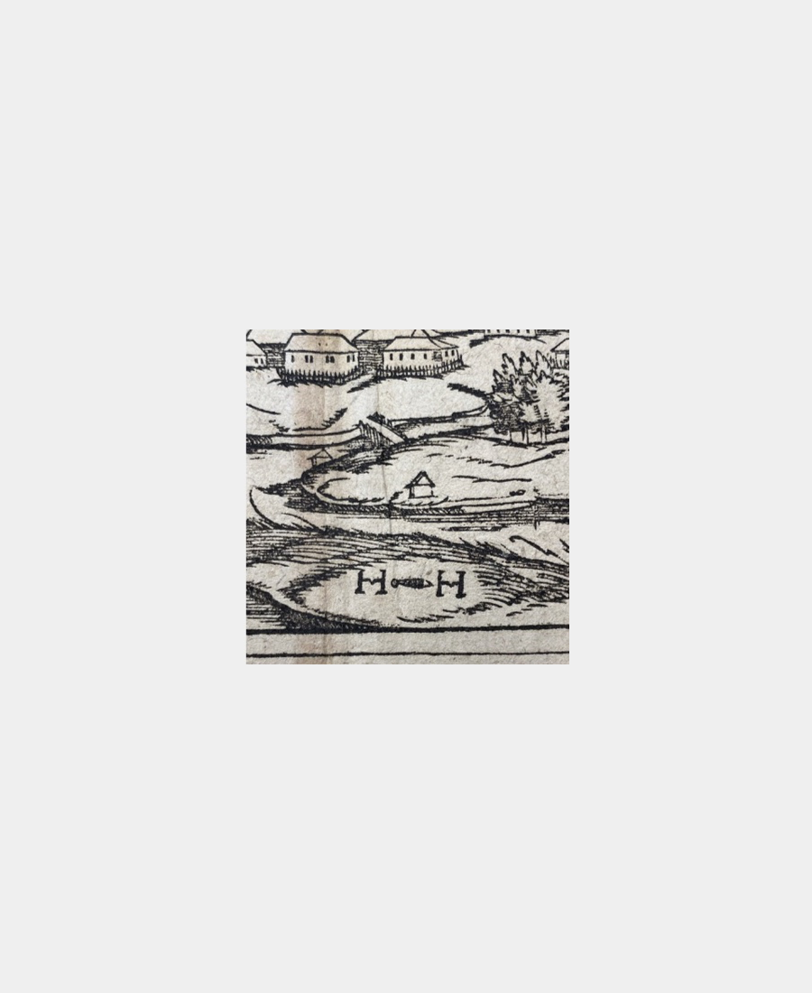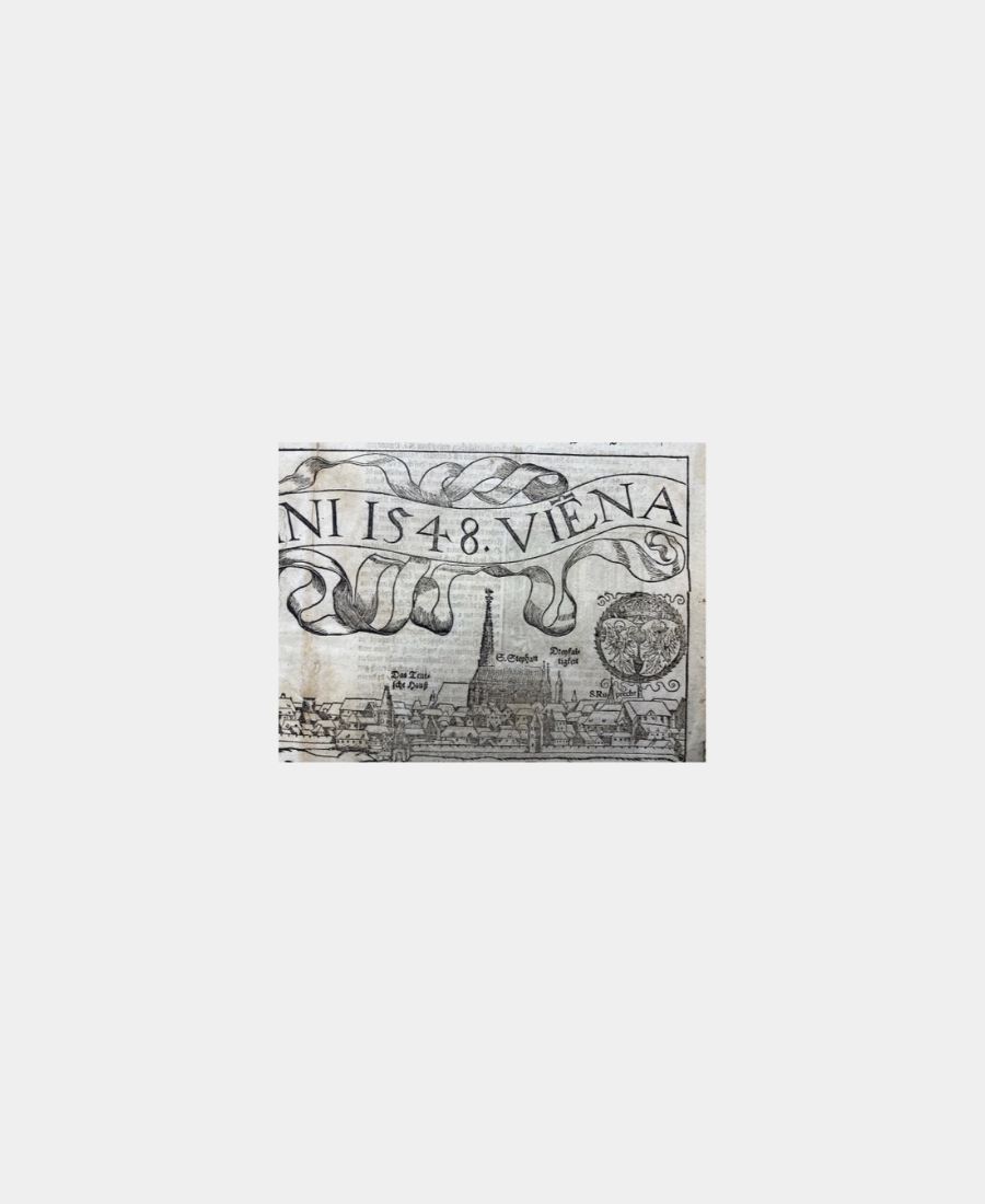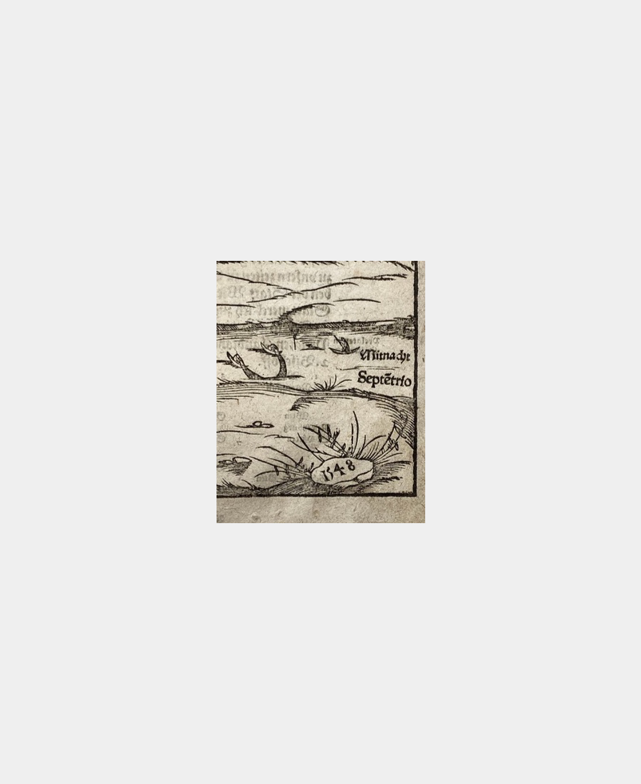 Sa composition est agrémentée de phylactères et rubans décoratifs de très belle facture. A noter que dans la Cosmographie, seules une dizaine de villes ont fait l’objet d’une représentation panoramique en double pages.