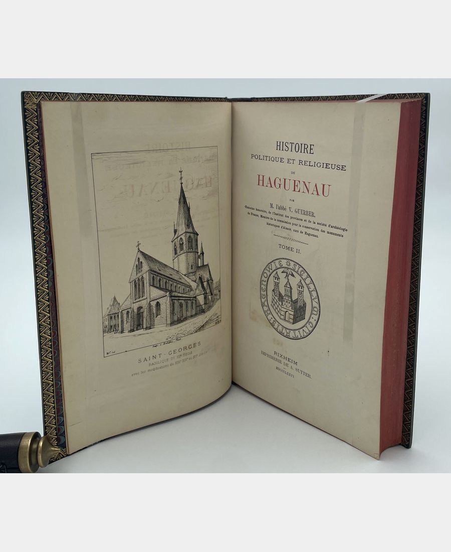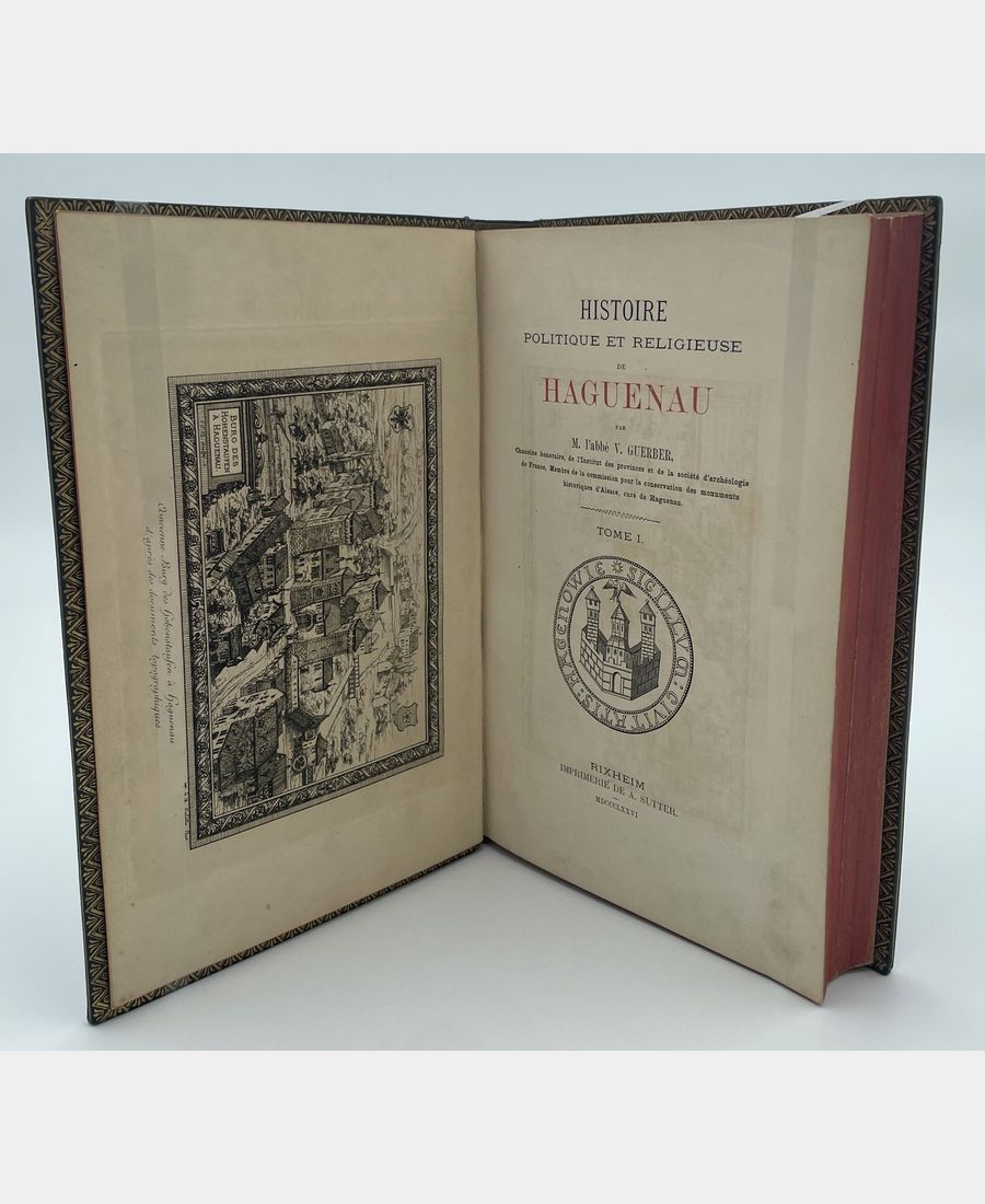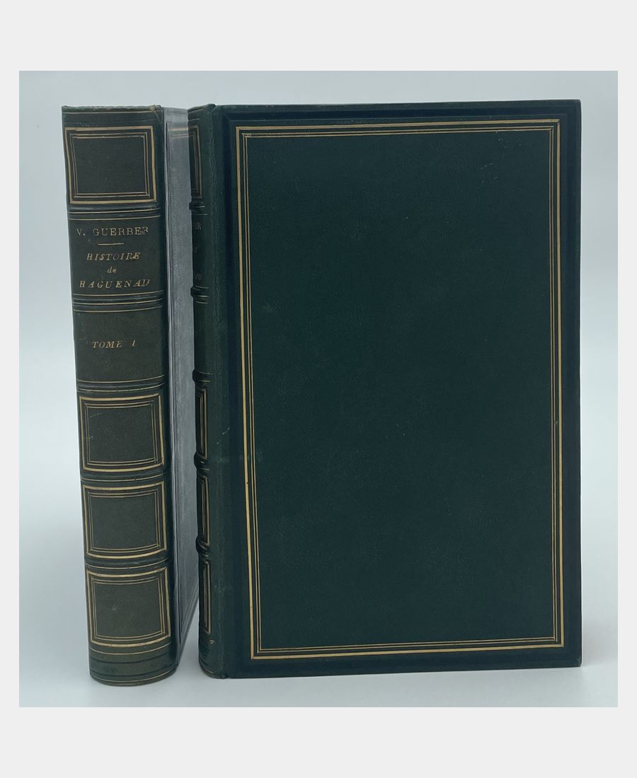 Rixheim, Imprimerie de A. Sutter, 1876 ; 2 volumes in-8 de XX + 581 + 507 pp. Plein chagrin vert bouteille d’époque, dos à nerfs, caissons dorés, avec auteur, titre et tomaison dorés. Triple filet d’encadrement doré sur les plats, filet sur les coupes, roulette sur les chasses. Quelques frottements et rousseurs éparses. Deux volumes bien complet des 10 eaux-fortes hors-texte. Etude par l’abbé Guerber, curé de l’église Saint-Georges de Haguenau. Bel exemplaire dans une jolie reliure signée Charles Wenger, relieur à Strasbourg.