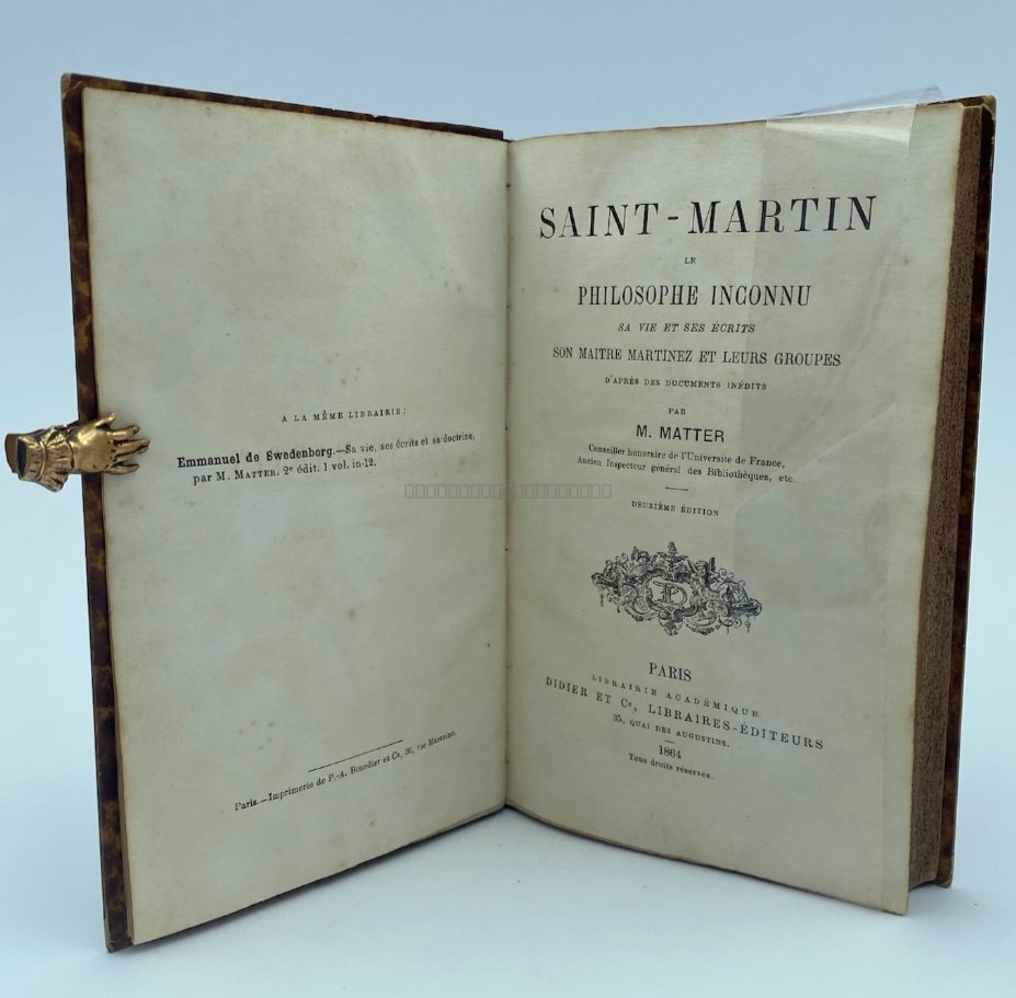Ouvrage de Jacques Matter, publié à Paris en 1864 (deuxième édition), consacré à Louis-Claude de Saint-Martin (1743–1803), dit « le Philosophe inconnu ». Cette étude biographique et historique retrace la vie, la formation et l’évolution spirituelle de Saint-Martin, figure majeure du mysticisme chrétien français du XVIIIe siècle. L’auteur y examine également l’influence déterminante de Martinez de Pasqually et des cercles des Élus Coëns sur la pensée de Saint-Martin, ainsi que la naissance des courants martinistes. S’appuyant sur des documents et témoignages de son époque, Matter propose une analyse érudite du cheminement intellectuel et mystique de son sujet, mettant en lumière son passage d’une théurgie initiatique vers une spiritualité intérieure et contemplative.