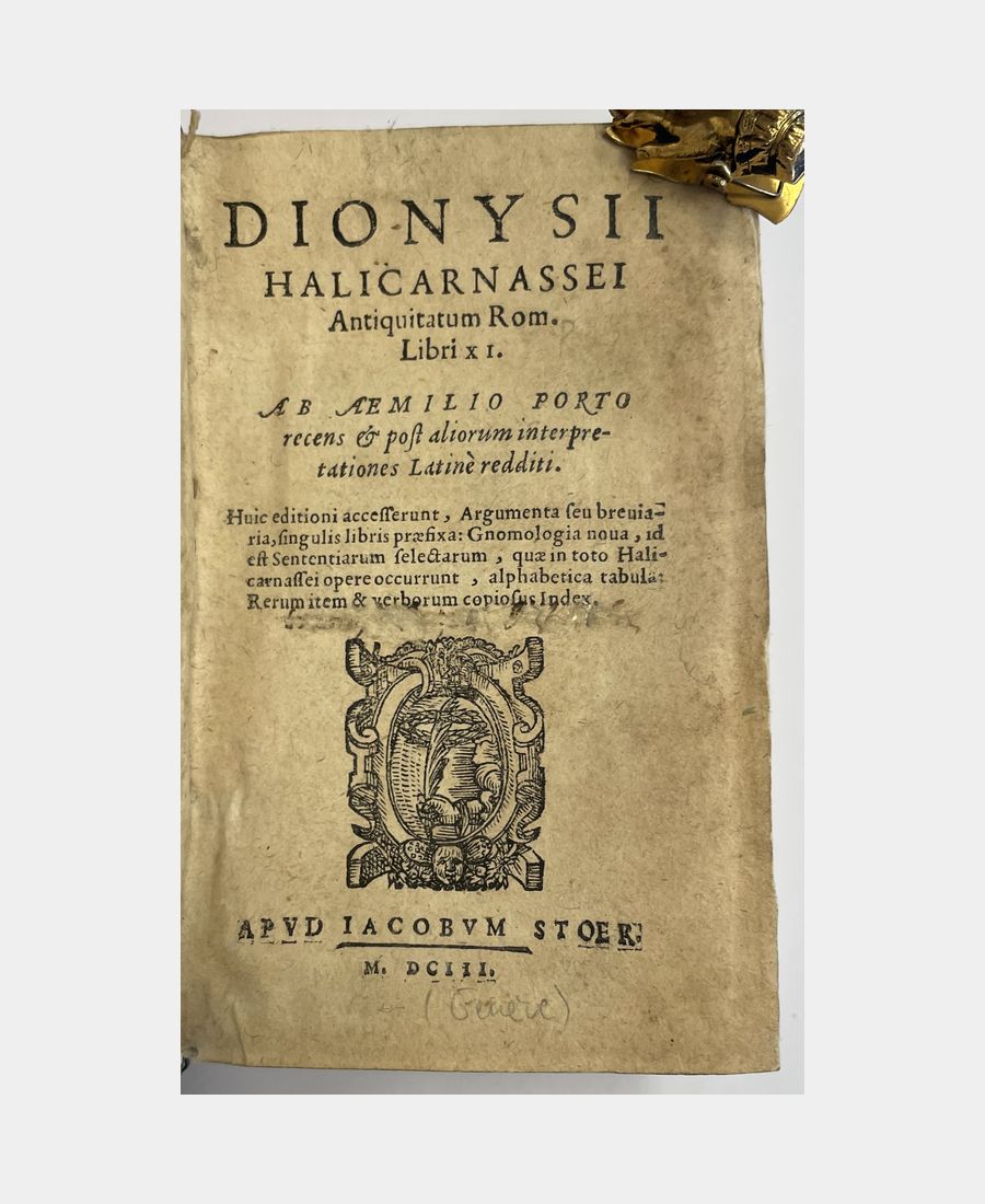 (Denys d’HALICARNASSE) Dionysii Halicarnassei. Antiquitatum Rom. Libri XI. Ab Aemilio Porto recens & post aliorum interpretationes latinè redditi. Relié à la suite : De Rerum inventoribus scriptores varii. Prosa et carmine.