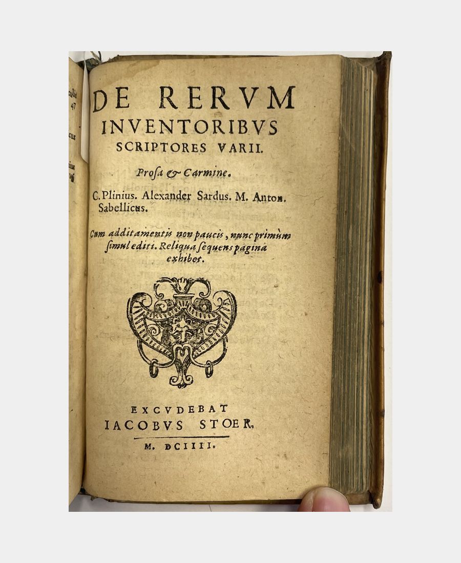Sl., Jacob Stoer, 1603 ; fort in-18 de (16) ff. n. ch. dont le titre + 1010 pp. + (15) ff n. ch. d’index nominum. Vélin ivoire d’époque, dos lisse avec titre manuscrit. Relié à la suite : De Rerum inventoribus scriptores varii. Prosa et carmine. C. Plinius. Alexander Sardus. M. Anton. Sabellicus. Sl. Jacob Stoer, 1604. 126 pp + 1 ff.