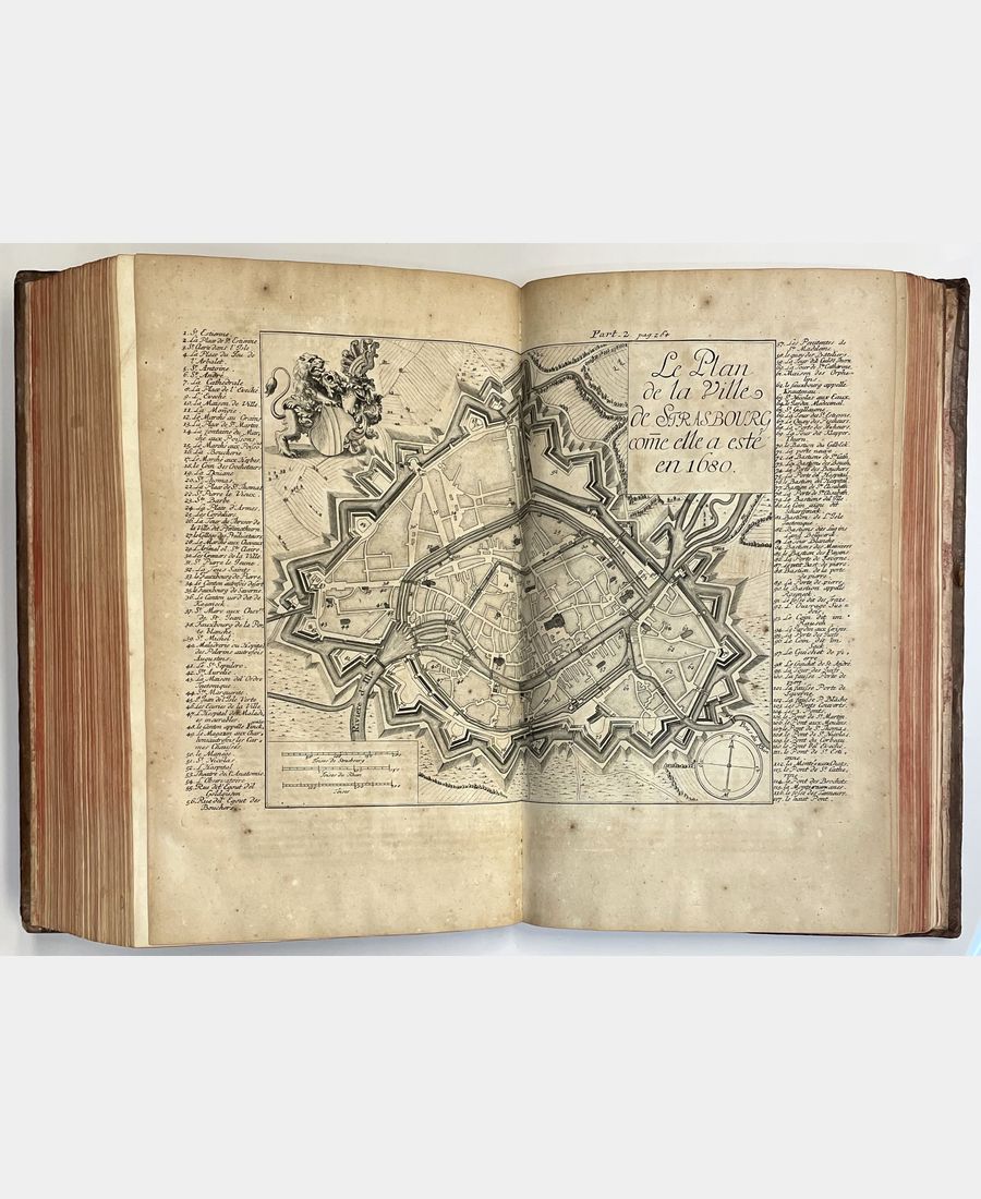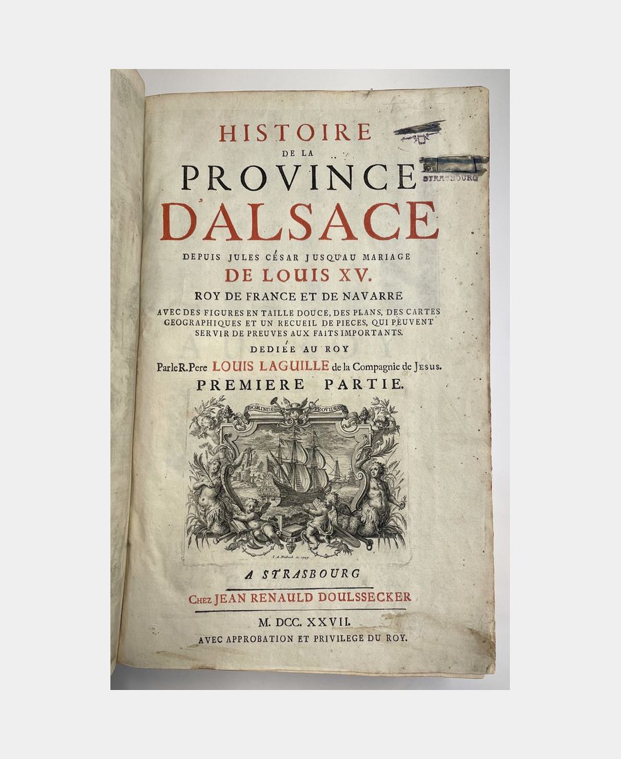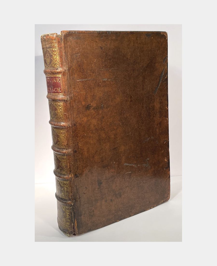 Strasbourg, Jean Renauld Doulssecker, 1727. 3 parties en un volume in-folio de (10) ff. + XVI pp.+ (4) ff. + 372 pp. + (17) ff. + (8) ff. + 362 pp.+ (10) ff.+ (2) ff. + 185pp., (2) ff. Plein veau d’époque, dos à nerfs orné de caissons et de fleurons dorés, pièce de titre. Mors en partie fendus, épidermures, coiffes et coins émoussés. Anciens tampons sur la page de titre en partie découpés et rayés entrainant une décharge sur les 3 feuillets suivants. Quelques rousseurs et feuillets jaunis. Bien complet du frontispice de Jacob Andreas Friedrich (1684-1751), de la carte géographique d’Alsace en trois parties, de la carte du Mont Sainte-Odile, des deux gravures de statues et bas-relief, des deux plans de Strasbourg et du Privilège du Roi.
