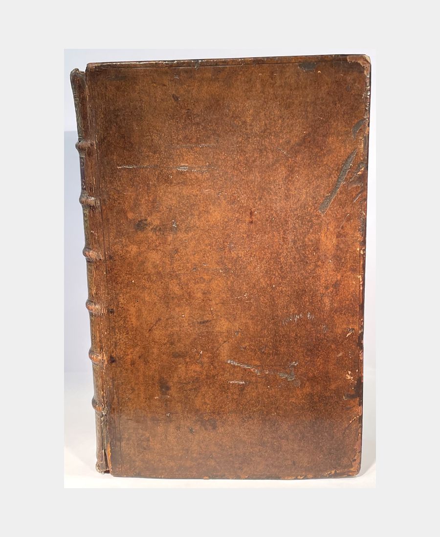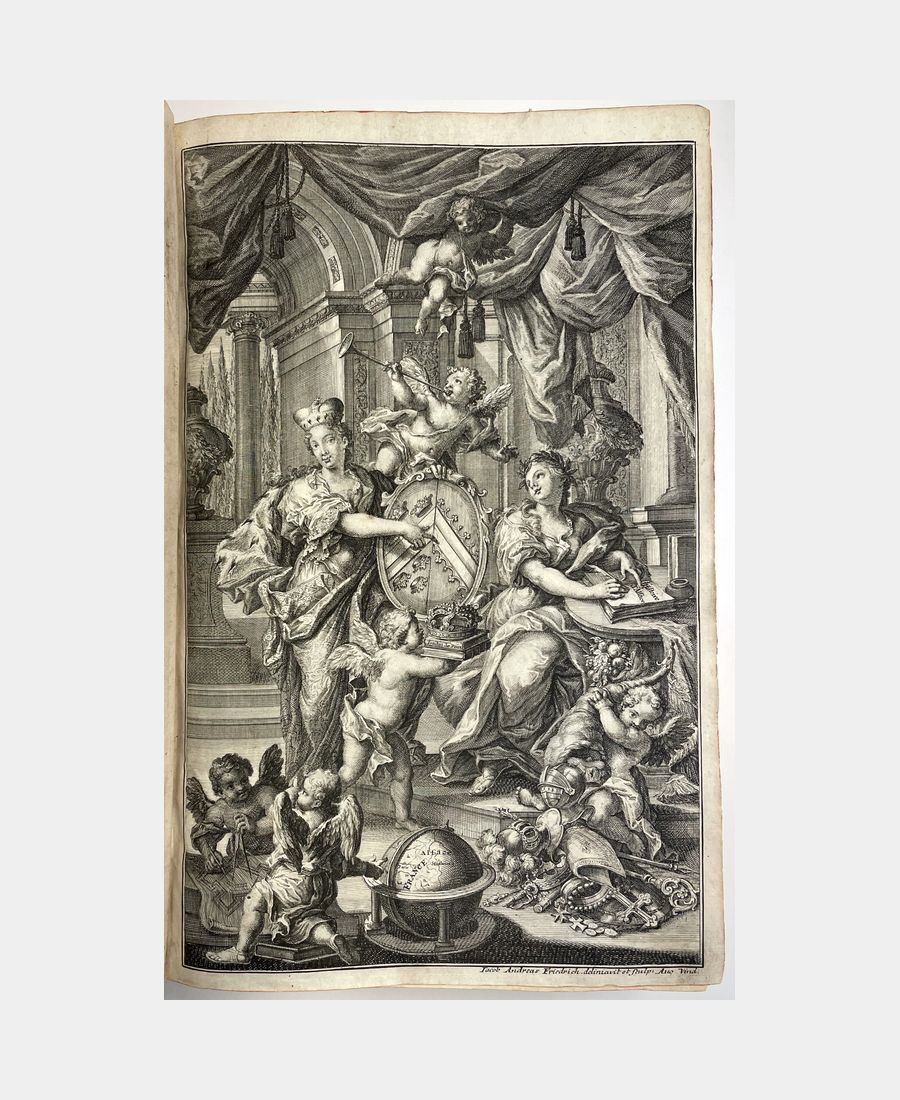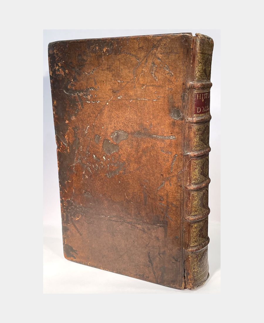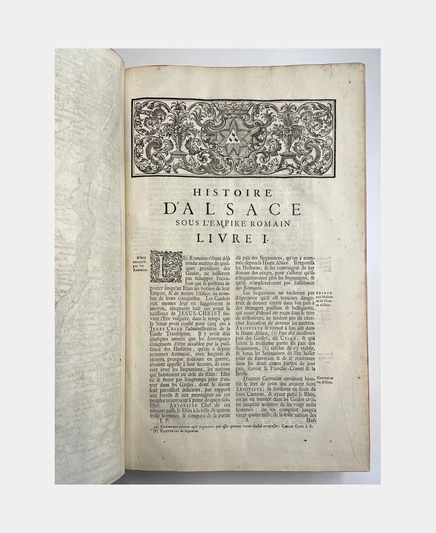 Strasbourg, Jean Renauld Doulssecker, 1727. 3 parties en un volume in-folio de (10) ff. + XVI pp.+ (4) ff. + 372 pp. + (17) ff. + (8) ff. + 362 pp.+ (10) ff.+ (2) ff. + 185pp., (2) ff. Plein veau d’époque, dos à nerfs orné de caissons et de fleurons dorés, pièce de titre. Mors en partie fendus, épidermures, coiffes et coins émoussés. Anciens tampons sur la page de titre en partie découpés et rayés entrainant une décharge sur les 3 feuillets suivants. Quelques rousseurs et feuillets jaunis. Bien complet du frontispice de Jacob Andreas Friedrich (1684-1751), de la carte géographique d’Alsace en trois parties, de la carte du Mont Sainte-Odile, des deux gravures de statues et bas-relief, des deux plans de Strasbourg et du Privilège du Roi.