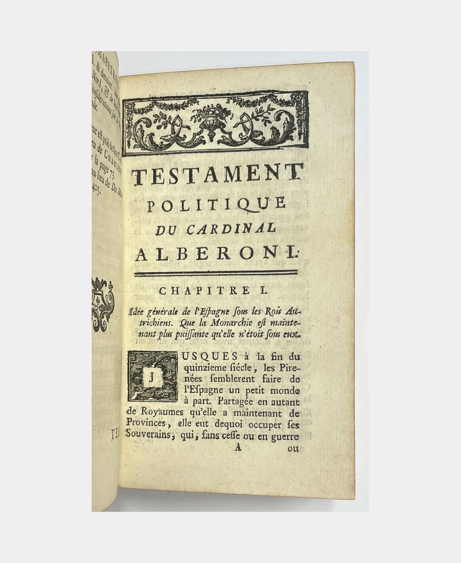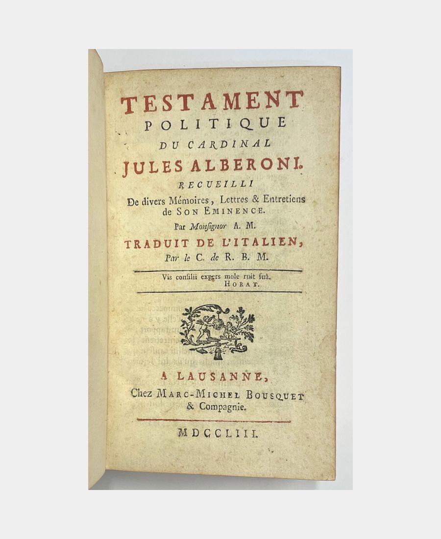 Lausanne, Chez Marc-Michel Bousquet & Compagnie, 1753 ; in-12 de XXX + 460 pp. Plein veau de l’époque, dos à nerfs, pièce de titre, caissons ornés de fleurons. Édition originale. Testament apocryphe de Giulio Alberoni (Plaisance, 1664 – Plaisance, 1752), cardinal et ministre de Philippe V d’Espagne, attribué à Maubert de Gouvert ou à Durey de Morsan.