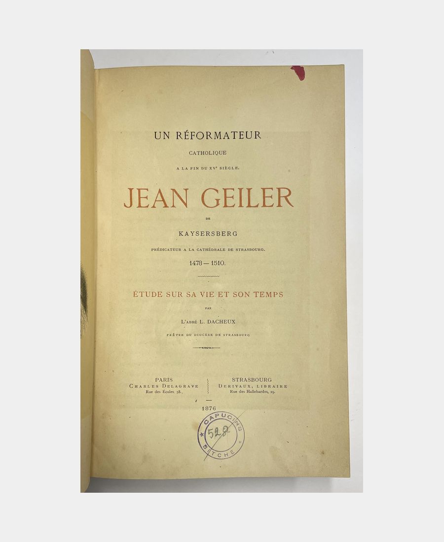 Un réformateur catholique à la fin du XVe siècle. Jean Geiler de Kaysersberg, prédicateur à la cathédrale de Strasbourg 1478 – 1510. Etude sur sa vie et son temps. Dacheux (Léon, Abbé). 1876.