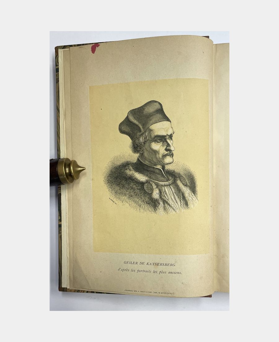 Paris et Strasbourg, Charles Delagrave et Derivaux, 1876 ; in-8 de 583 pages et XCV pages de pièces justificatives. Demi-toile, dos lisse avec filets à froid, titre et auteur dorés. Cachet de bibliothèque sur la page de titre et marque d’encre rouge sur la page de titre et le frontispice. Portrait de Geiler en frontispice et fac-similé d’un autographe de Geiler.