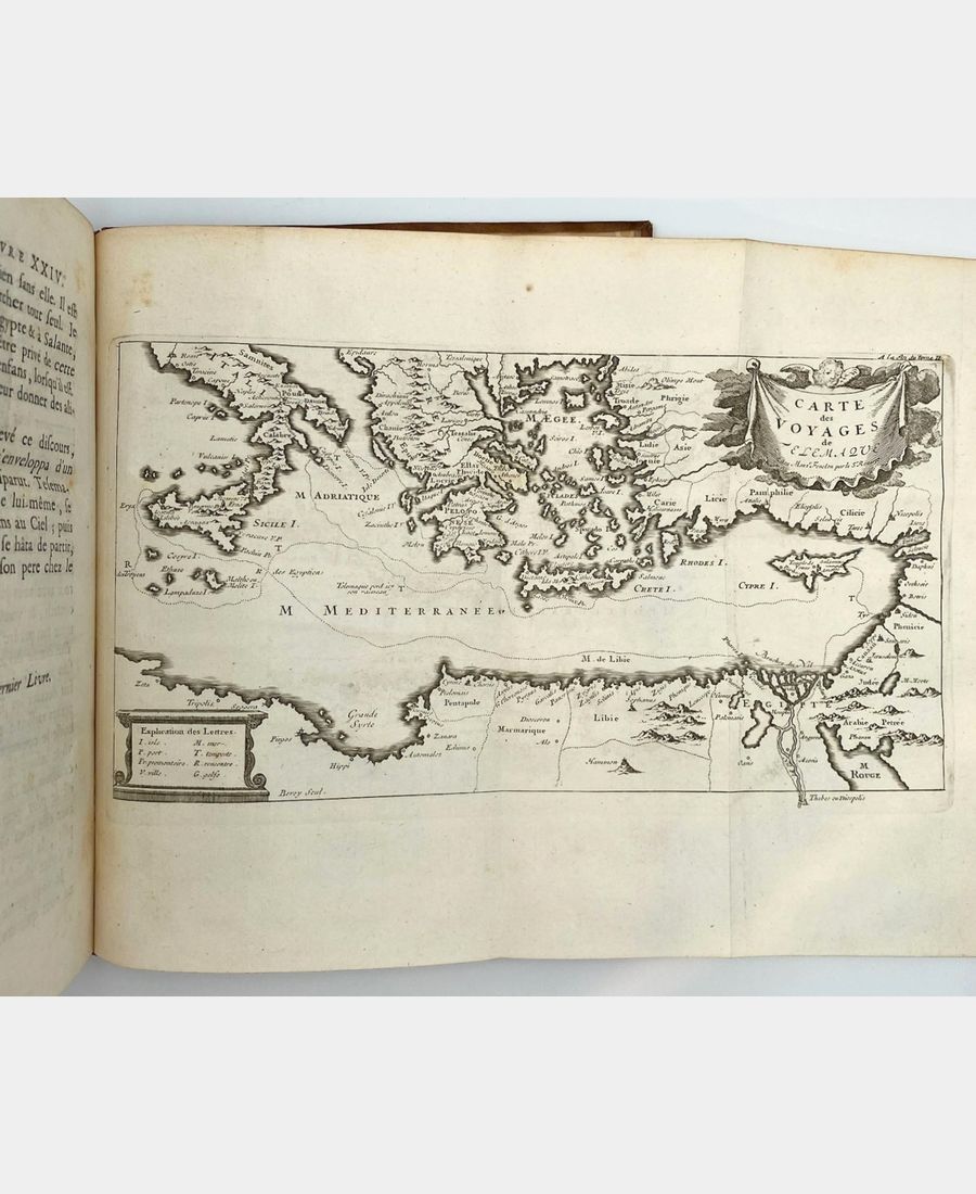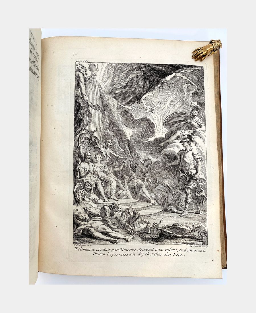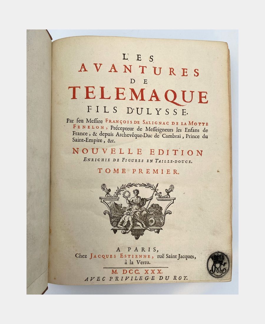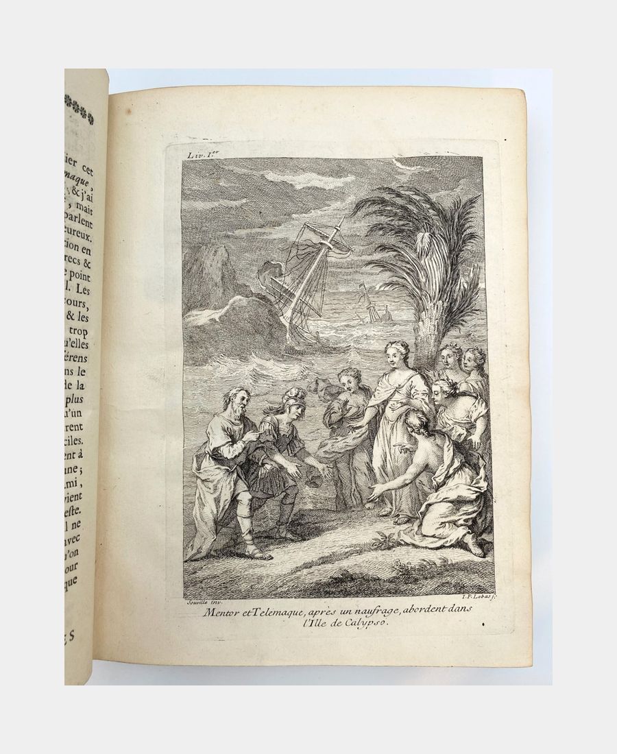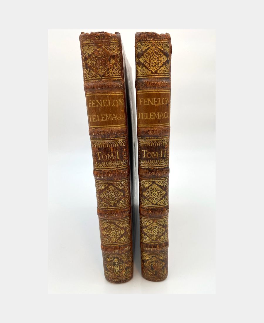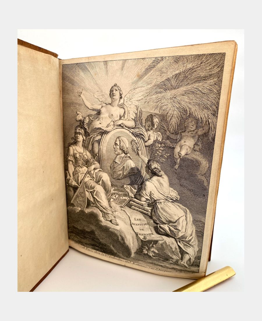 Cohen & De Ricci 379-380. Cette nouvelle édition est enrichie de figures en taille-douce. Le premier tome comprend un frontispice gravé par Tardieu d’après Coypel présentant le portrait de M. de Fénelon sur laquelle la Vertu s’appuie et est soutenu par Minerve tenant les armes du Dauphin et Calliope appuyée sur trois livres symbolisant les trois genres de la Poésie. Ce volume contient également une vignette dans le texte et 12 gravures sur cuivre pleine page et hors texte. Elles sont dessinées par Coypel, Sauville et Favanne, et sont gravées par Tardieu, Lebas, Scotin, Haussard, Favanne, Beauvais, Dupuis. Le second tome est agrémenté de 12 gravures sur cuivre pleine page et hors texte, dessinées par Cazes, Coypel et Humblot et gravées par Lebas, Scotin, Dupuy, Favanne, Bacquois, Mathey. In fine, une carte dépliante retrace le trajet des aventures de Télémaque.