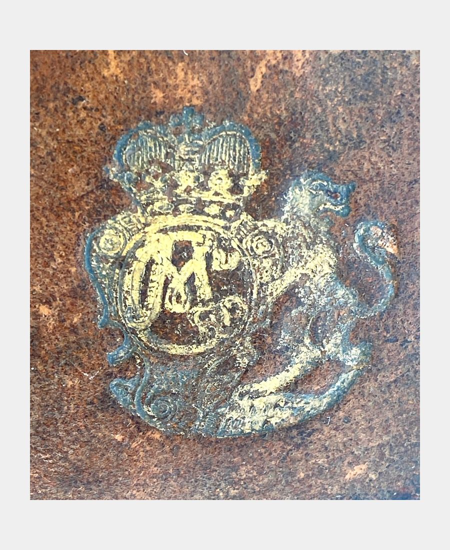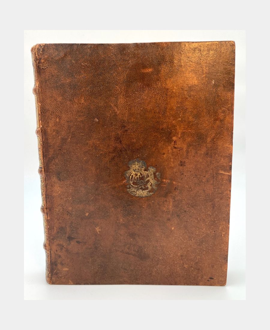 La reliure est aux armes de la Duchesse Charlotte Marie von Schleswig-Holstein-Sonderburg-Augustenburg (1697 – 1760), épouse du duc Philipp Ernst von Schleswig-Holstein-Sonderburg-Glücksburg. On trouve également son cachet aux initiales et couronne sur chaque page de titre. La dorure des armes est un peu effacée, n’altérant néanmoins pas la lisibilité et l’identification de ces dernières.