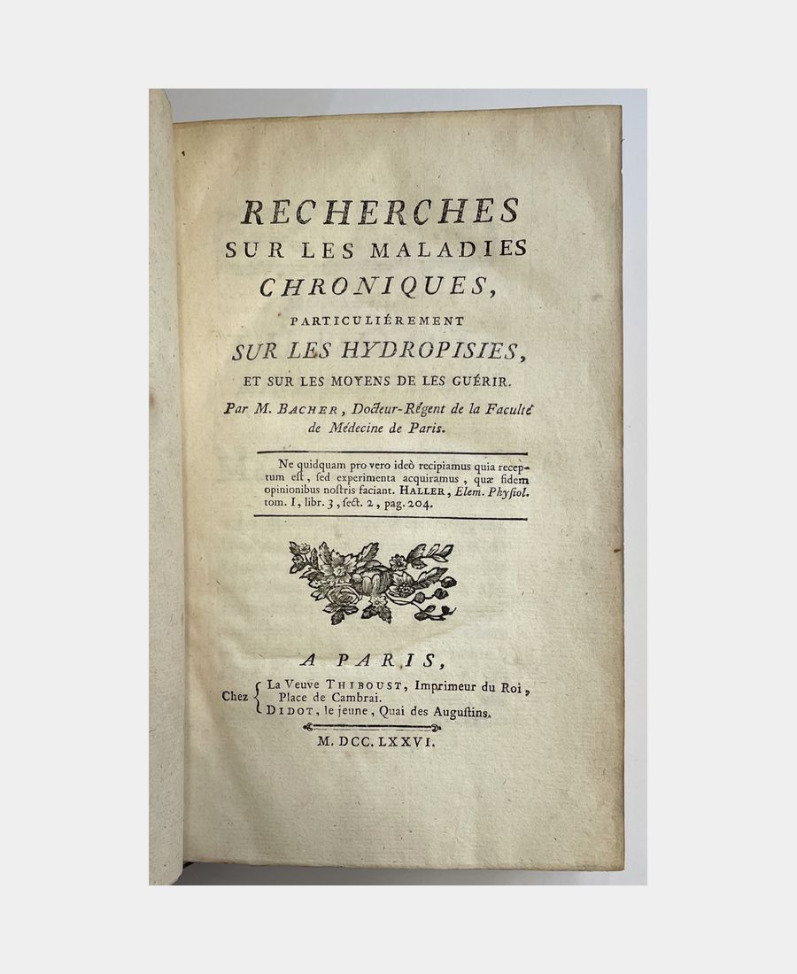 Paris, chez la Veuve Thiboust et Didot le jeune, 1776 ; in-8 de XL + XV + 724 pp + 1 ff. Reliure plein veau d’époque, dos à nerfs et à caissons ornés de fleurons et pièce de titre. Filets d’encadrement dorés sur les plats. Mors légèrement fendus, coiffes restaurées. Georges Frédéric Bacher (Blotzheim, 1709 – Thann, 1798), médecin installé à Thann, fut l’inventeur des « Pillules dites toniques de Bacher ». Cet ouvrage fut achevé par son fils Alexandre (Thann, 1740 – Paris, 1808). Bibliographie des écrits sur l’hydropisie in-fine.