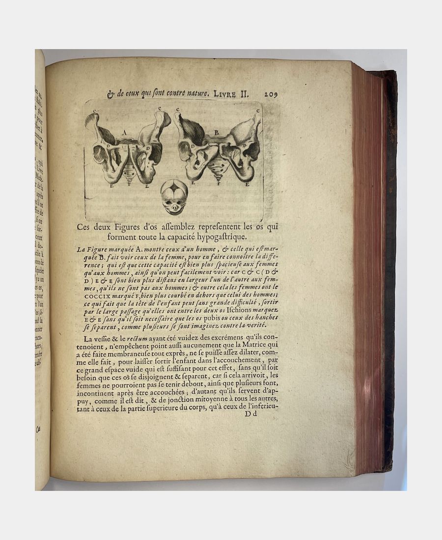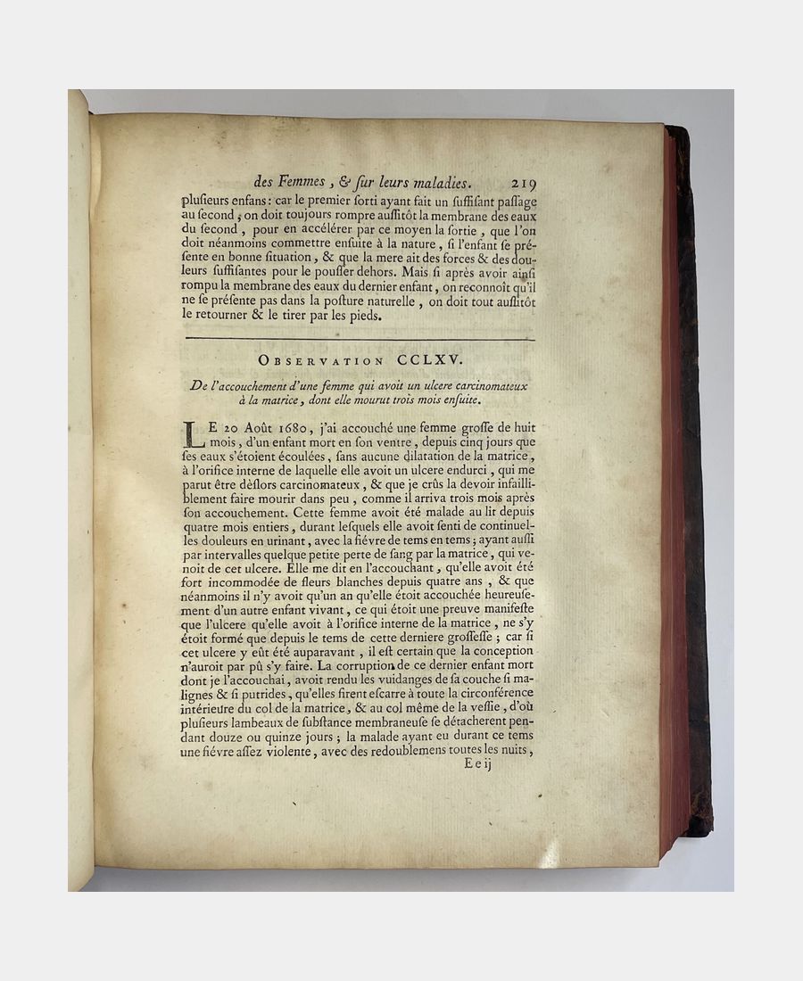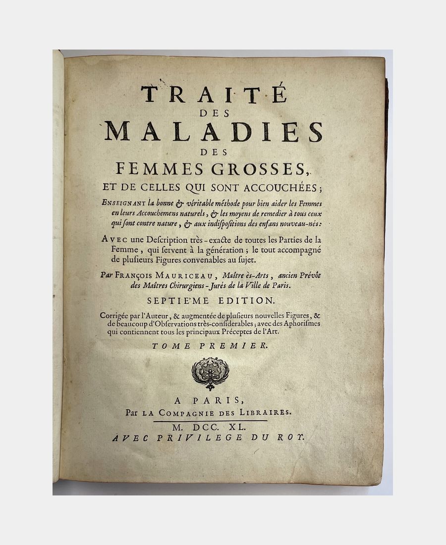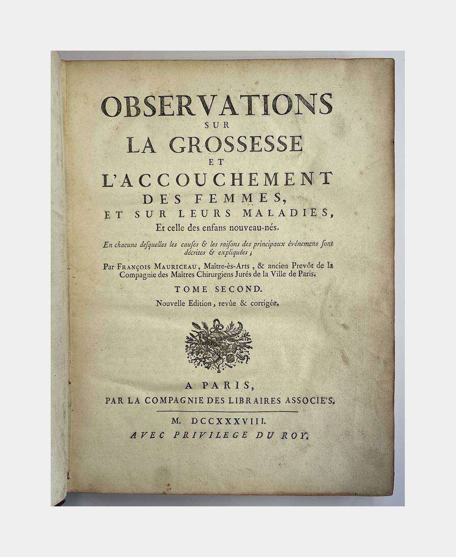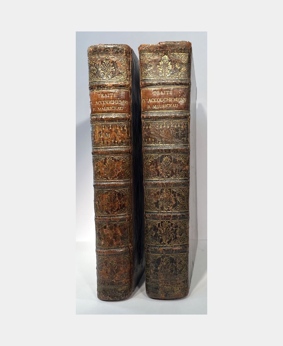 Paris, la Compagnie des Libraires, 1740 ; in-4 en deux tomes. Reliures plein veau d’époque, dos à nerfs décorés de caissons ornés de fleurons. Tranches rouges. Pièces de titre et de tomaison. Mors en partie fendus des plats supérieurs, épidermures et coins en partie émoussés. Septième édition revue et corrigée. Tome 1 : Traité des maladies des femmes grosses, et de celles qui sont accouchée, enseignant la bonne et véritable méthode pour bien aider les femmes en leurs Accouchements naturels, & les moyens de remédier à tous ceux qui sont contre nature, & aux indispositions des enfans nouveau-nés. 6 ff + 555 pp + 12 ff (table). Tome 2 : Observations sur la grossesse et l’accouchement des femmes et sur leurs maladies, et celles des enfants nouveau-nés. 4 ff + 671 pp. François Mauriceau (1637 -1709), est un chirurgien français, considéré comme l’un des fondateurs de la médecine obstétrique et cet ouvrage donne les bases de l’obstétrique.