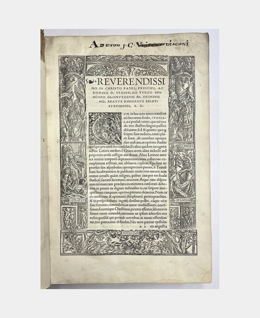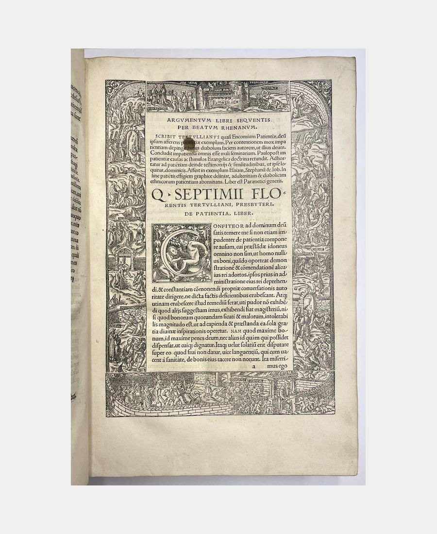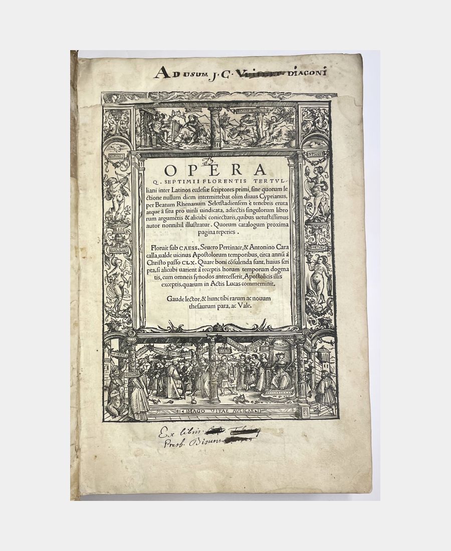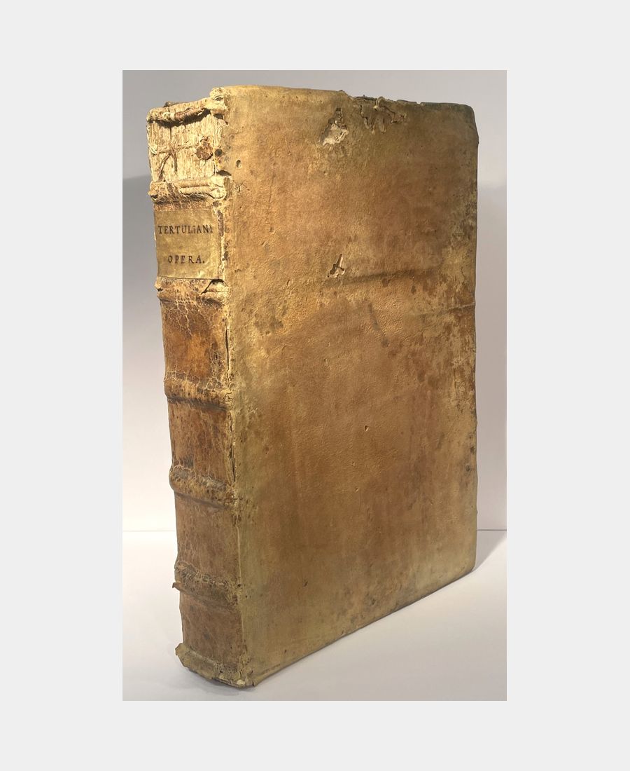 Bâle, Froben, 1521. In-folio de (14) f. + 615 pp. + (34) f.. Pleine reliure de l’époque en peau retournée, dos à 5 nerfs, pièce de titre manuscrite sur vélin. Epidermures et manque au dos dus à la fragilité de la peau utilisée. Déchirure, avec manque, dans la marge supérieure du 1er feuillet, petits travaux de vers et mouillures marginales. Première édition publiée par Beatus Rhenanus des œuvres et traités de Tertullien, théologien et Père de l’Eglise à partir notamment d’un manuscrit issu de la Bibliothèque de Payern, en possession de l’humaniste sélestadien. Cette édition est agrémentée de trois grands encadrements richement illustrés, dont la page de titre gravée par Ambrosius Holbein.