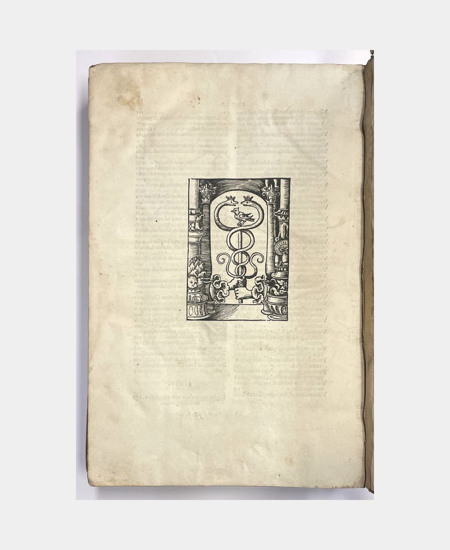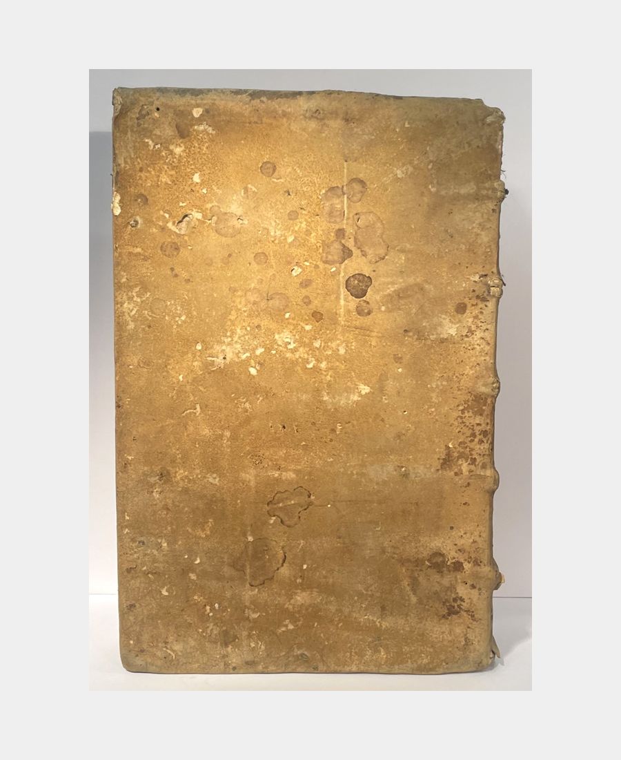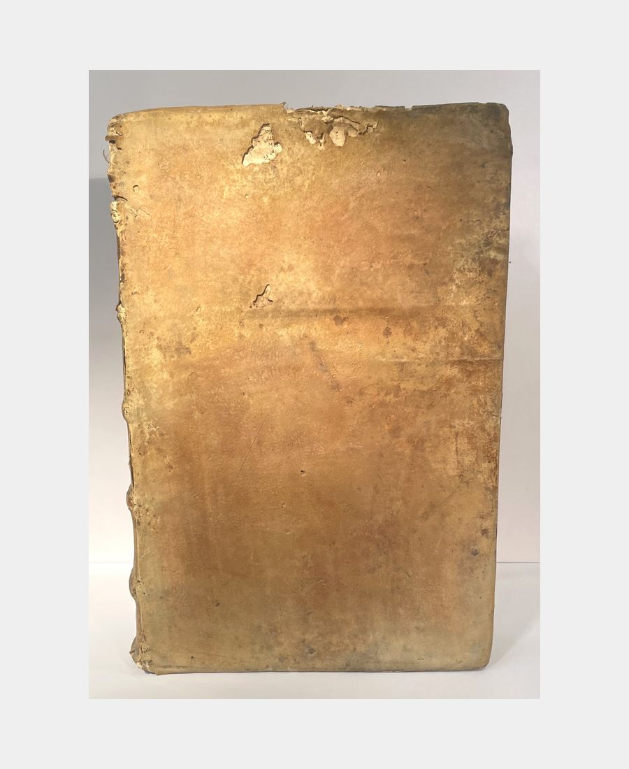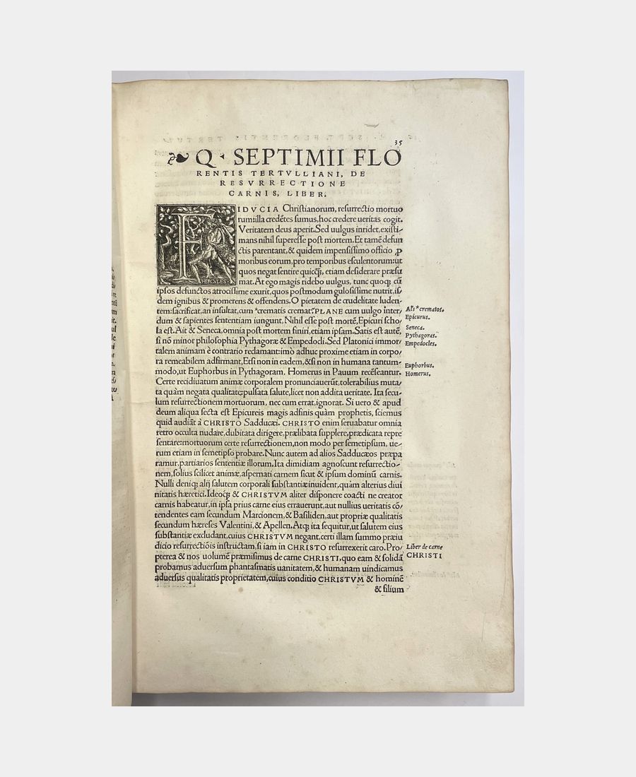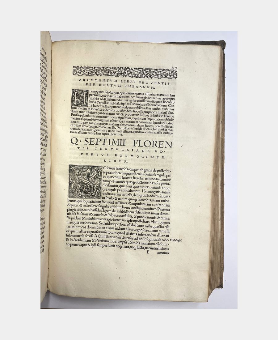 Bâle, Froben, 1521. In-folio de (14) f. + 615 pp. + (34) f.. Pleine reliure de l’époque en peau retournée, dos à 5 nerfs, pièce de titre manuscrite sur vélin. Epidermures et manque au dos dus à la fragilité de la peau utilisée. Déchirure, avec manque, dans la marge supérieure du 1er feuillet, petits travaux de vers et mouillures marginales. Première édition publiée par Beatus Rhenanus des œuvres et traités de Tertullien, théologien et Père de l’Eglise à partir notamment d’un manuscrit issu de la Bibliothèque de Payern, en possession de l’humaniste sélestadien. Cette édition est agrémentée de trois grands encadrements richement illustrés, dont la page de titre gravée par Ambrosius Holbein.