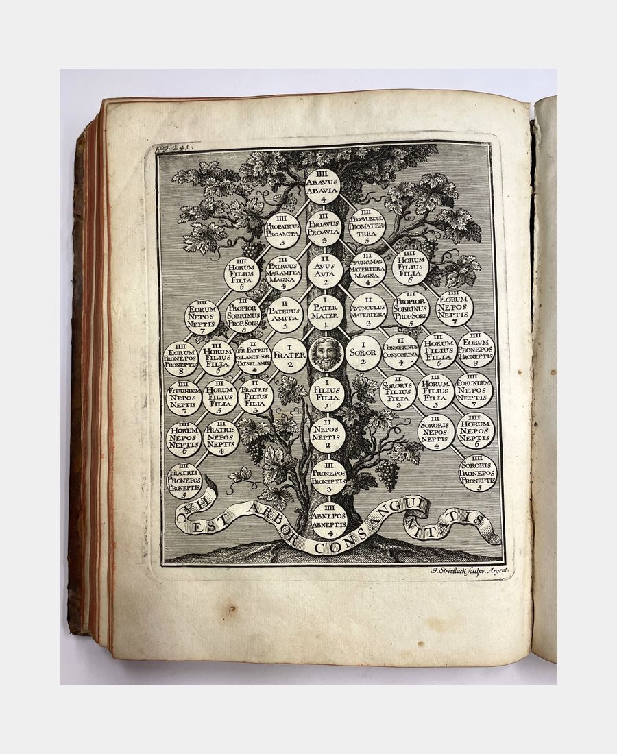Strasbourg, Le Roux, 1742 ; in-4 de (16) ff. + 426 pp. + (7) ff. Plein veau d’époque, dos à nerfs, pièce de titre, caissons ornés de fleurons dorés. Reliure usagée aux coiffes et mors arasés avec quelques travaux de restauration, mouillures en début d’ouvrage, quelques rousseurs. Exemplaire bien complet des 2 planches hors-texte et des dix vignettes gravées par Jean Striedbeck d’après Parrocel.