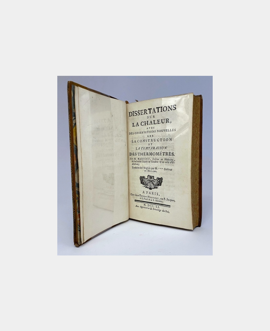 George MARTINE (Ecosse 1700 – 1741) , était un médecin et physicien écossais. Le présent ouvrage est consacré à la thermométrie et à l’étude expérimentale de la chaleur. Cette édition originale rassemble ses recherches publiées après sa mort et sera largement reprise et diffusée dans les compilations scientifiques du XVIIIᵉ siècle.